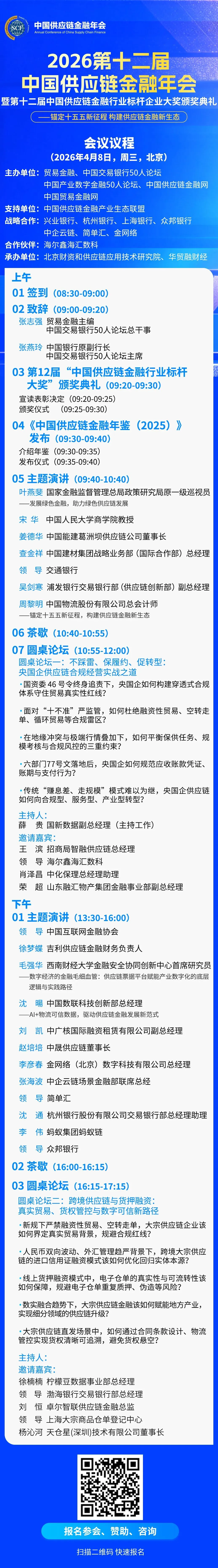 4月8日,北京将召开2026第十二届中国供应链金融年会,是当下国企不容错过的行业盛会。诚邀各位业内同仁莅临现场,共学供应链金融进阶之道,共探供应链金融高质量发展的转型路径!