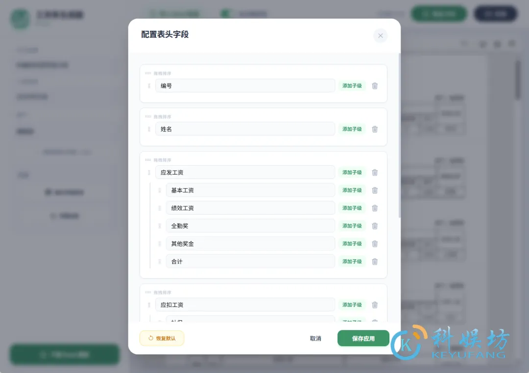 在工资表的表头字段配置中,可以设置工资条的显示顺序及内容,同样自定义字段名称,每个公司的工资结构都是不同的,你可以根据自己的顺序内容自行添加,改完了之后点击【保存应用】即可。