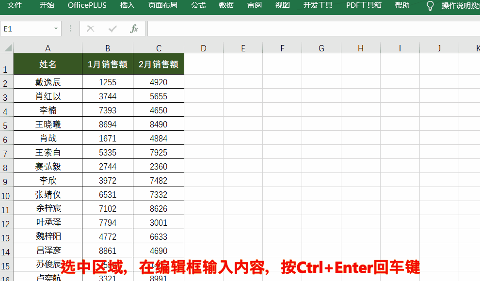 选中区域,在【编辑栏】中输入内容,再按Ctrl+Enter 即可
