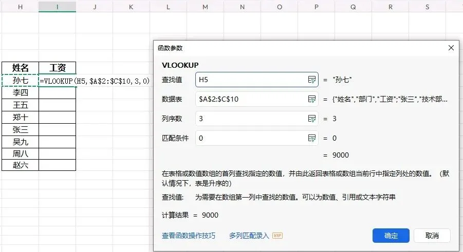 - 在哪找:$A$2:$C$10(姓名+部门+工资区域,F4锁定)