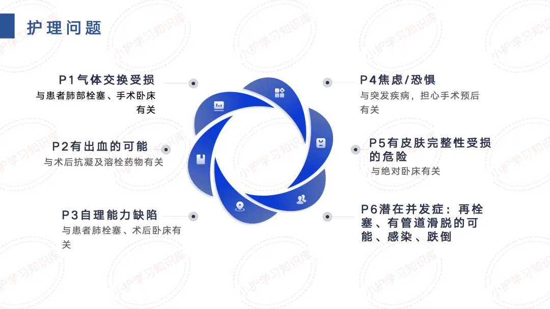 P1气体交换受损,与患者肺部栓塞、手术卧床有关。