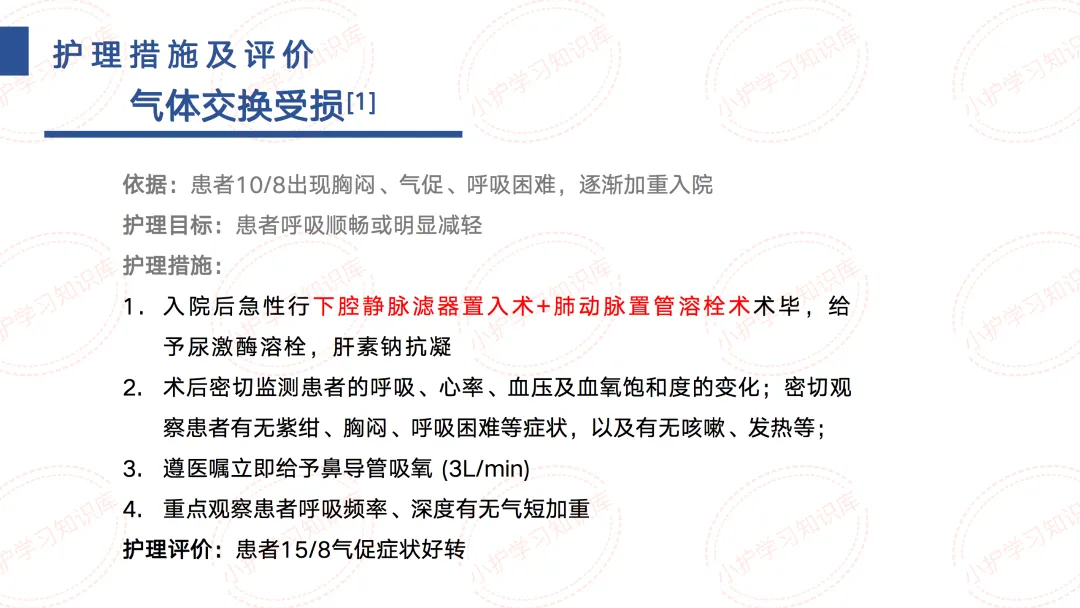 针对P1气体交换受损,患者入院后急性行下腔静脉滤器置入术+肺动脉置管溶栓术术毕,给予尿激酶溶栓,肝素钠抗凝。