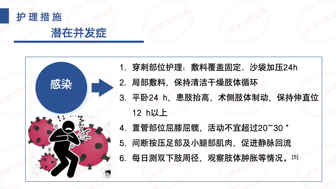 针对P5有皮肤完整性受损的危险及潜在并发症感染,穿刺部位护理需敷料覆盖固定、沙袋加压24h。