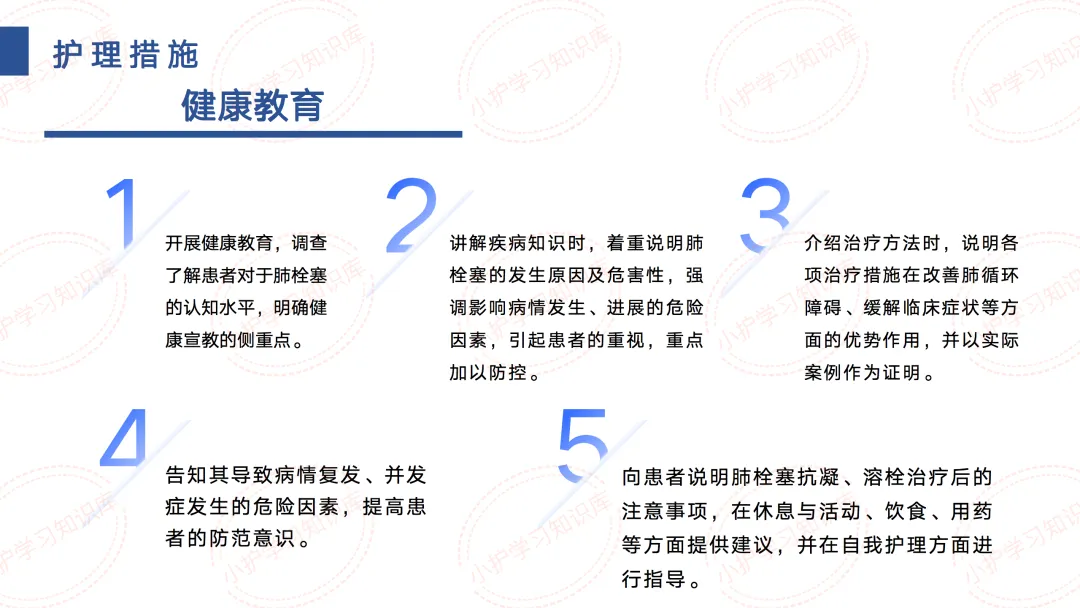 讲解疾病知识时,着重说明肺栓塞的发生原因及危害性,强调影响病情发生、进展的危险因素,引起患者的重视,重点加以防控。