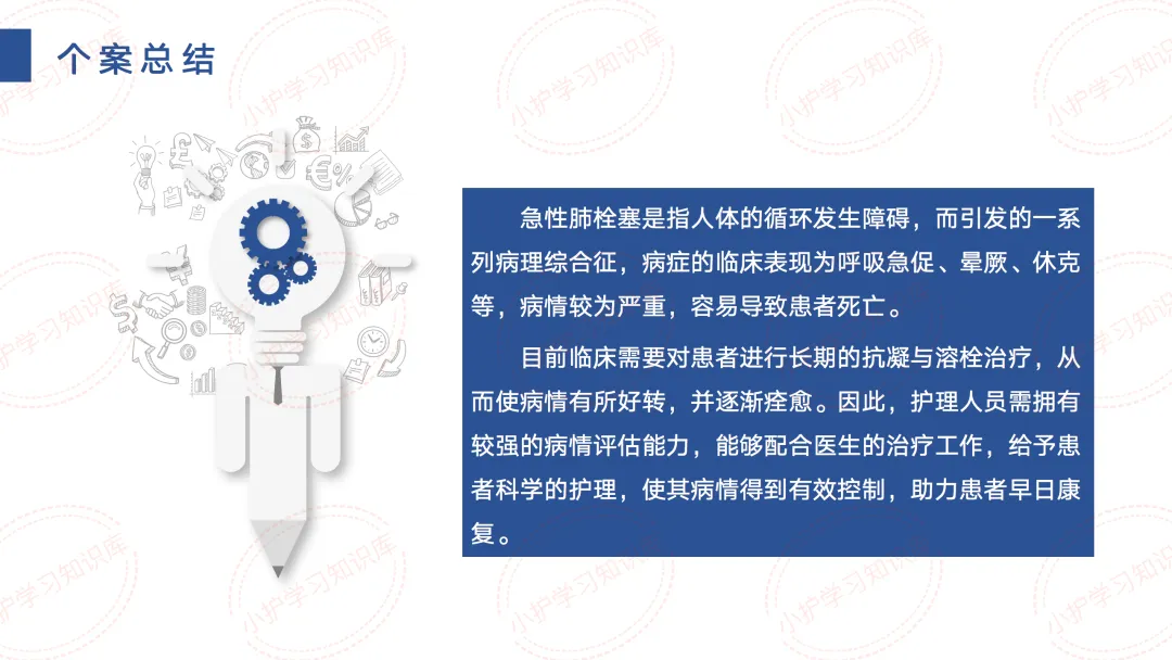 在个案总结中,急性肺栓塞是指人体的循环发生障碍,而引发的一系列病理综合征,病症的临床表现为呼吸急促、晕厥、休克等,病情较为严重,容易导致患者死亡。