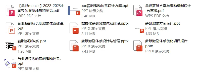 《薪酬激励体系设计方案包》,共22份资料,包括薪酬激励体系PPT和薪酬激励体系系列资料。部分资料展示如下: