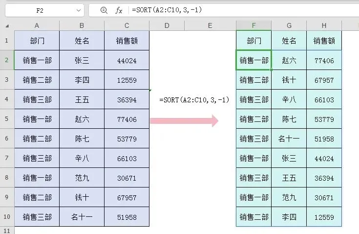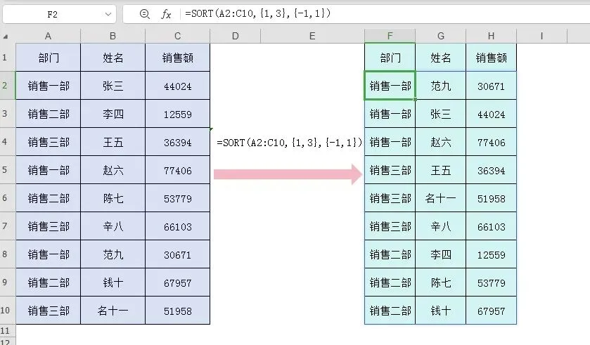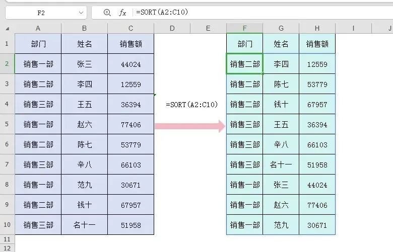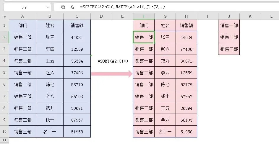 可以在F2单元格输入公式=SORT(A2:C10),不用下拉右拉,公式结果自动溢出。整个公式就一个参数,其他三个都省略,就默认对第1列,升序,按行排序。为什么是销售二部、销售三部、销售一部,而不是销售一部、销售二部、销售三部?我们等下再说。2、按单列排序