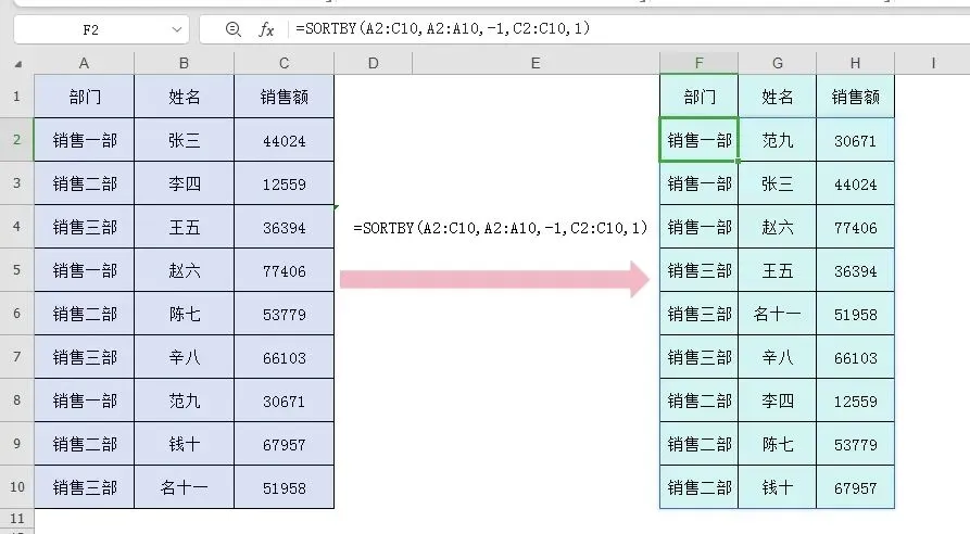 现有A1:C10数据,需按A列部门进行降序排序,C列销售额升序排序。可以在F2单元格输入公式=SORT(A2:C10,{1,3},{-1,1}),不用下拉右拉,公式结果自动溢出。二、SORTBY函数