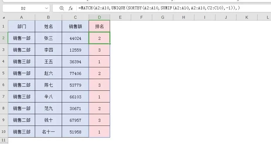 不管SORT或SORTBY函数或其他函数,单一的功能其实都很简单,主要是结合其他函数的嵌套来解决综合的问题,这才是学习函数的奥妙或有趣之处。下面我们来一个综合运用。现有A1:C10数据,需按C列销售额对A列销售部门进行排名。=MATCH(A2:A10,UNIQUE(SORTBY(A2:A10,SUMIF(A2:A10,A2:A10,C2:C10),-1)),)SUMIF(A2:A10,A2:A10,C2:C10)先求出每个销售部的销量。这两个函数工作中也经常用到,记不住参数没关系,用的时候再查也没关系,只要我们知道是怎么用的就行了。