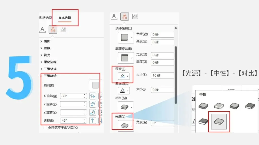 再切到【三维格式】,给【深度】设为 16 磅,并更改下颜色,做出厚度;【光源】选【中性】,让厚度的颜色更自然: