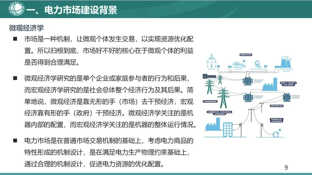 微观经济学研究的是单个企业或家庭参与者的行为和后果,而宏观经济学研究的是社会总体整个经济行为及其后果。简单地说,微观经济是靠无形的手(市场)去干预经济,宏观经济靠有形的手(政府)干预经济。微观经济学关注的是机器内部的配置,而宏观经济学关注的是机器的整体运行情况。电力市场是在普通市场交易机制的基础上,考虑电力商品的特性形成的机制设计,是在满足电力生产物理约束基础上,通过合理的机制设计,促进电力资源的优化配置。
