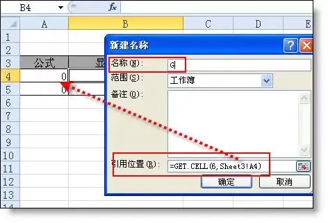 如想在B列显示A列公式,可通过定义名称实现。公式 - 名称管理器 - 新建名称:G =get.cell(6,sheet3!a4)