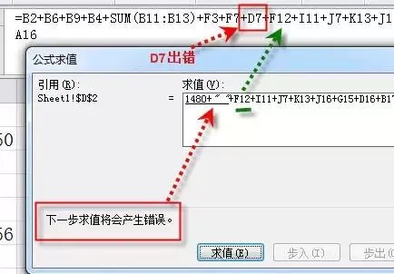 2、在打开的“公式求值”对话框中,求值会自动停在即将出错处。此时通过和编辑栏的公式进行比对,即可找出产生错误的单元格。(D7)