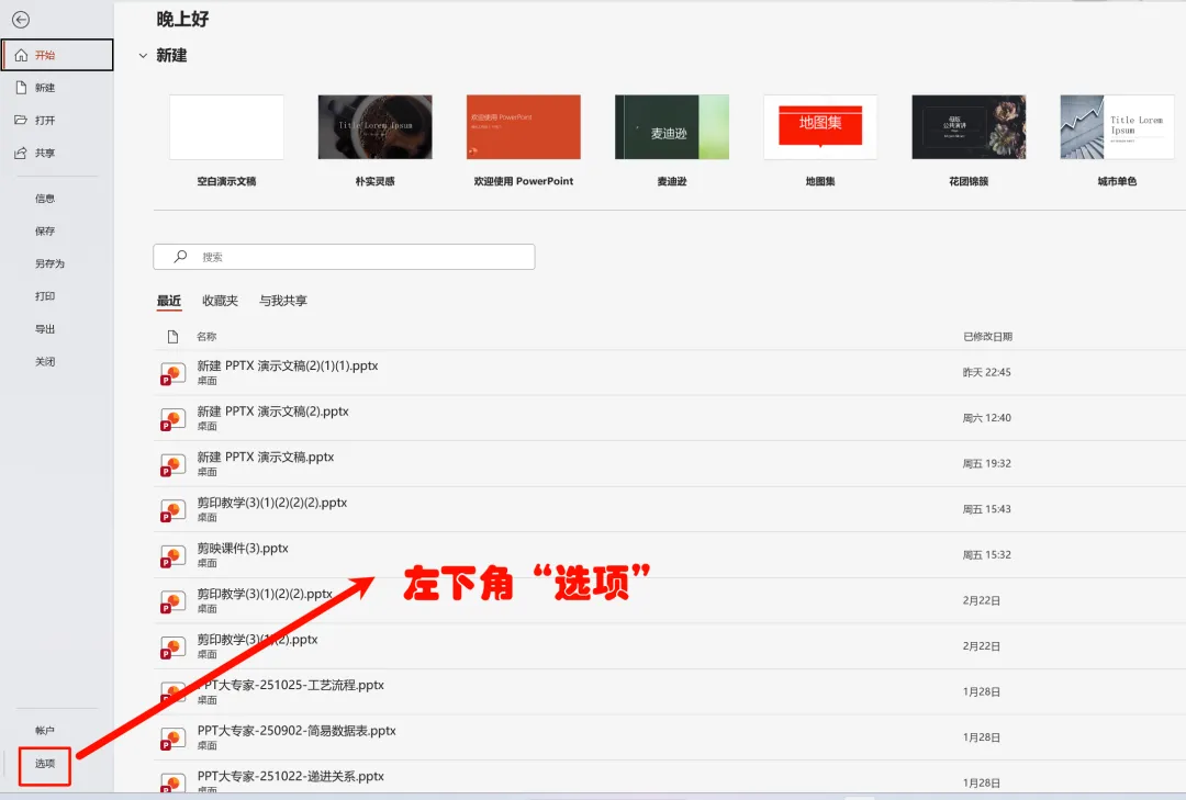 核心入口:打开PowerPoint → 点击左上角【文件】→ 左下角【选项】