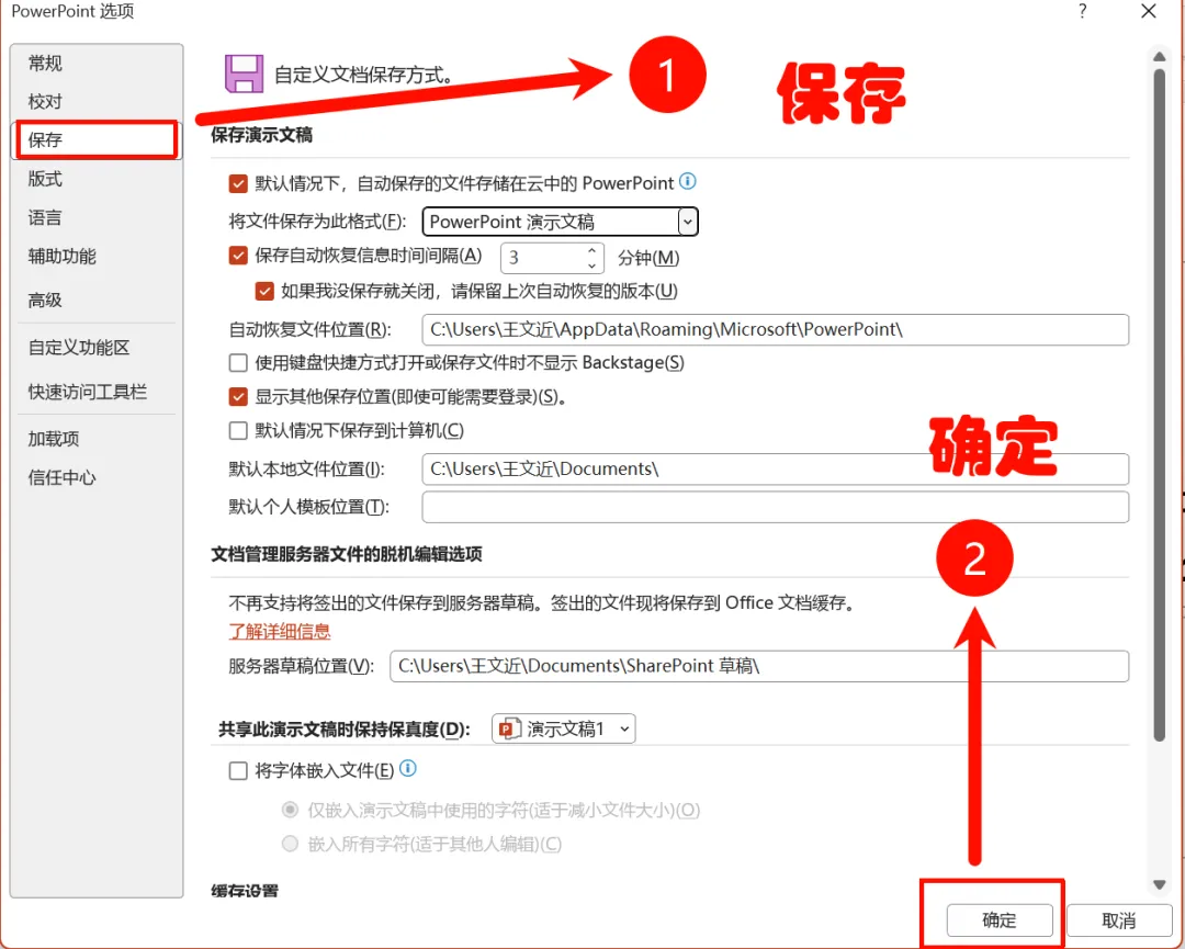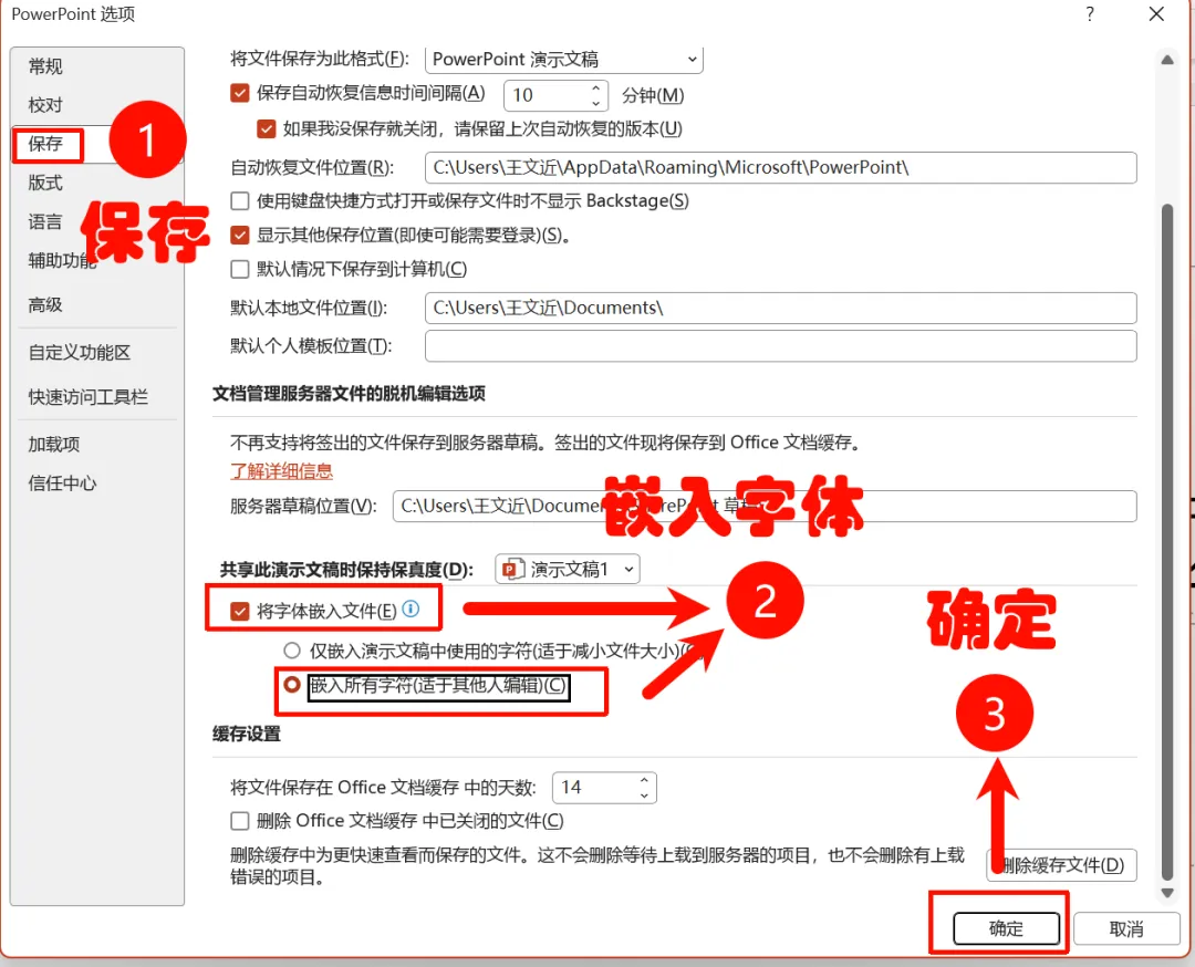 解决方案:【文件】→ 【选项】→ 【保存】→ 勾选“将字体嵌入文件”