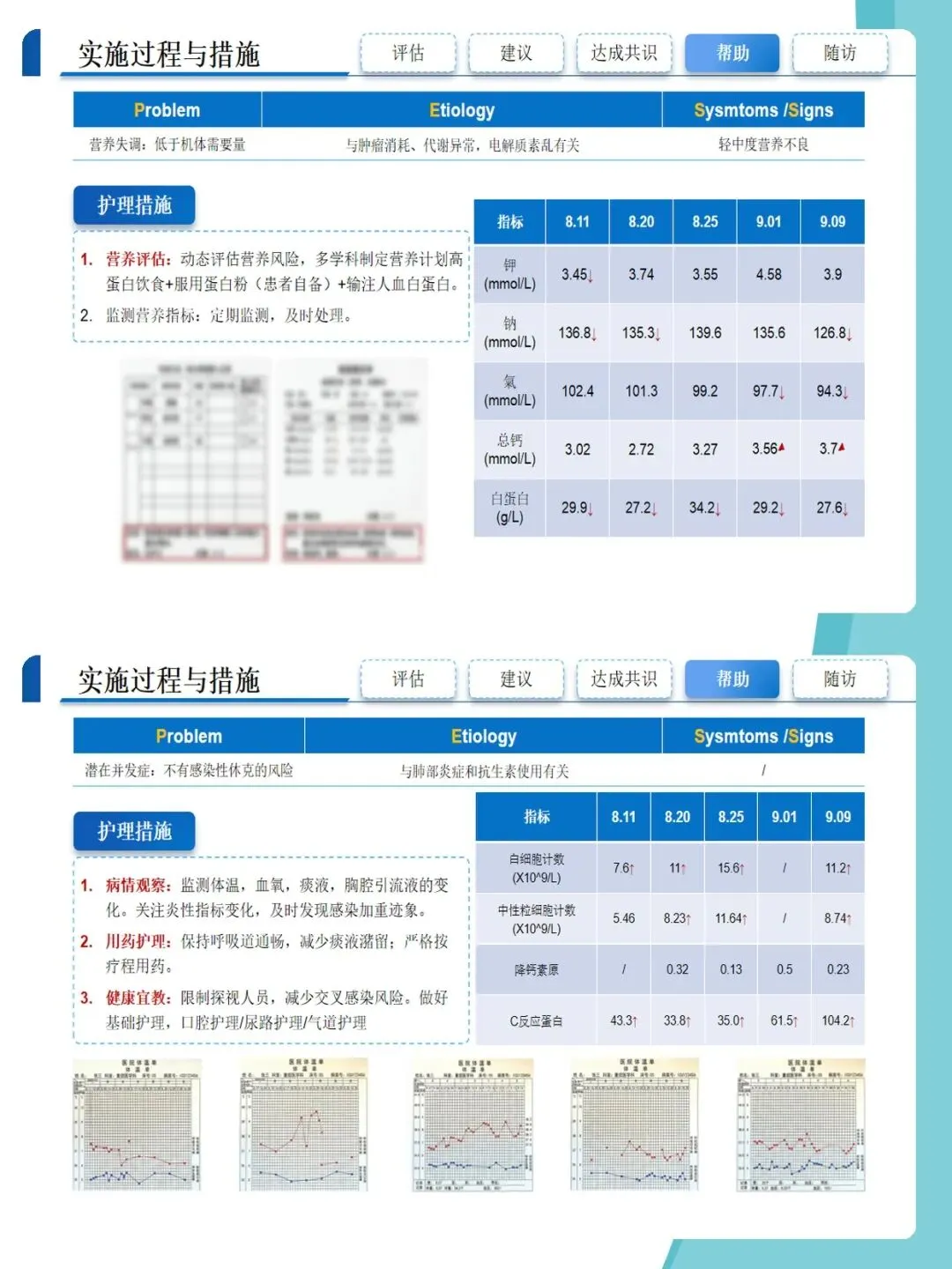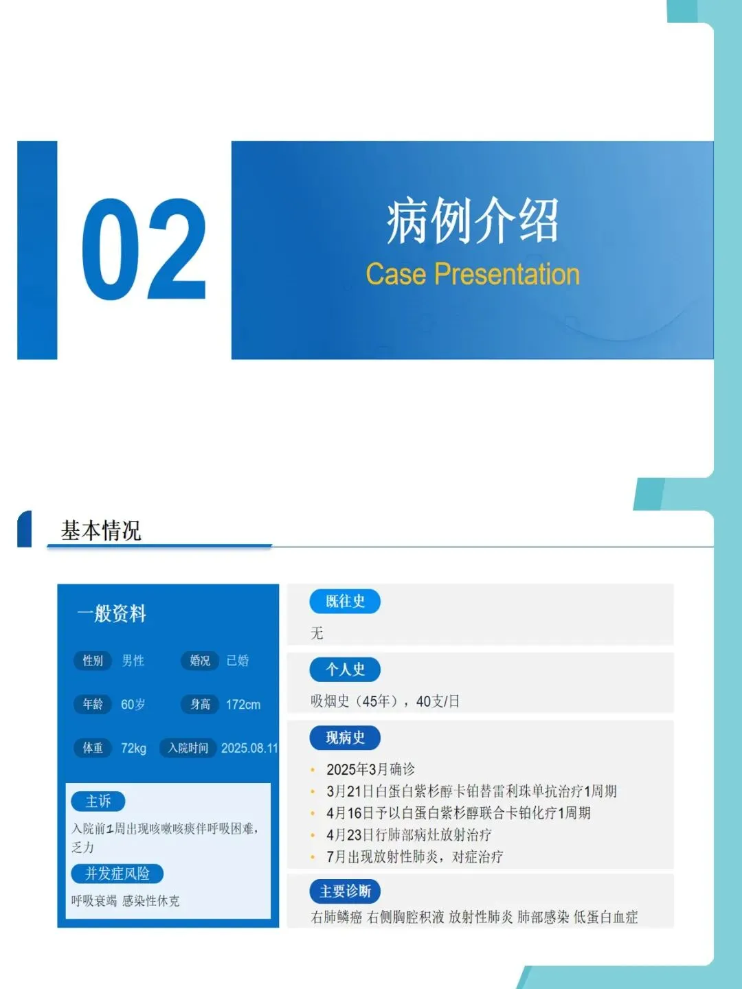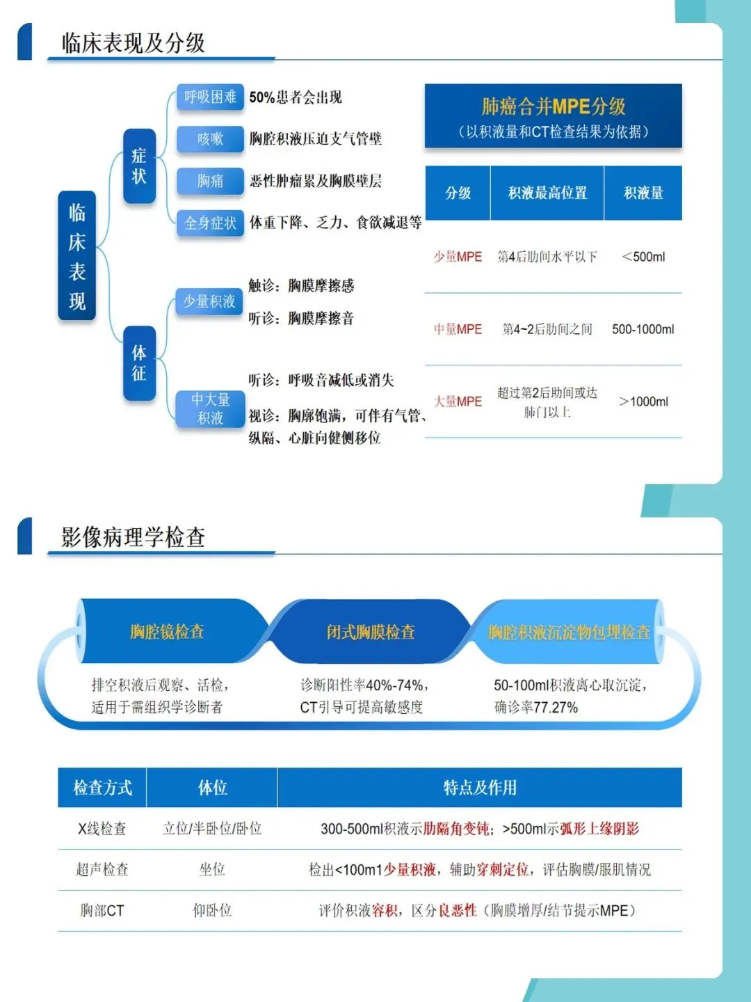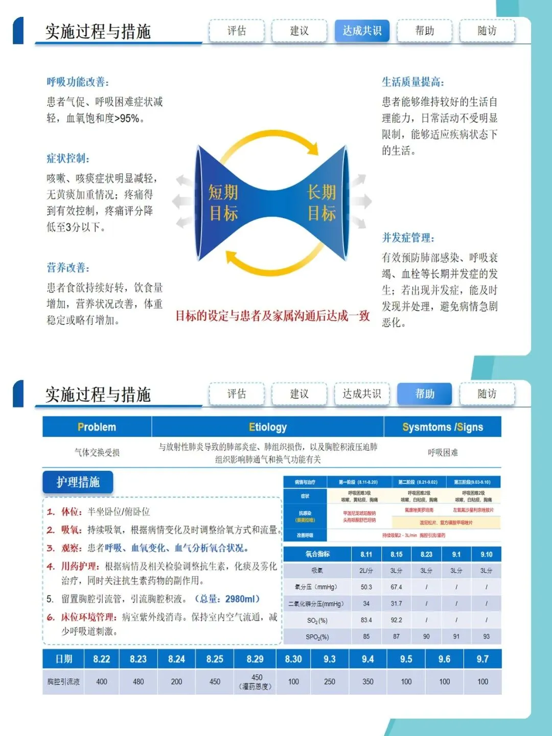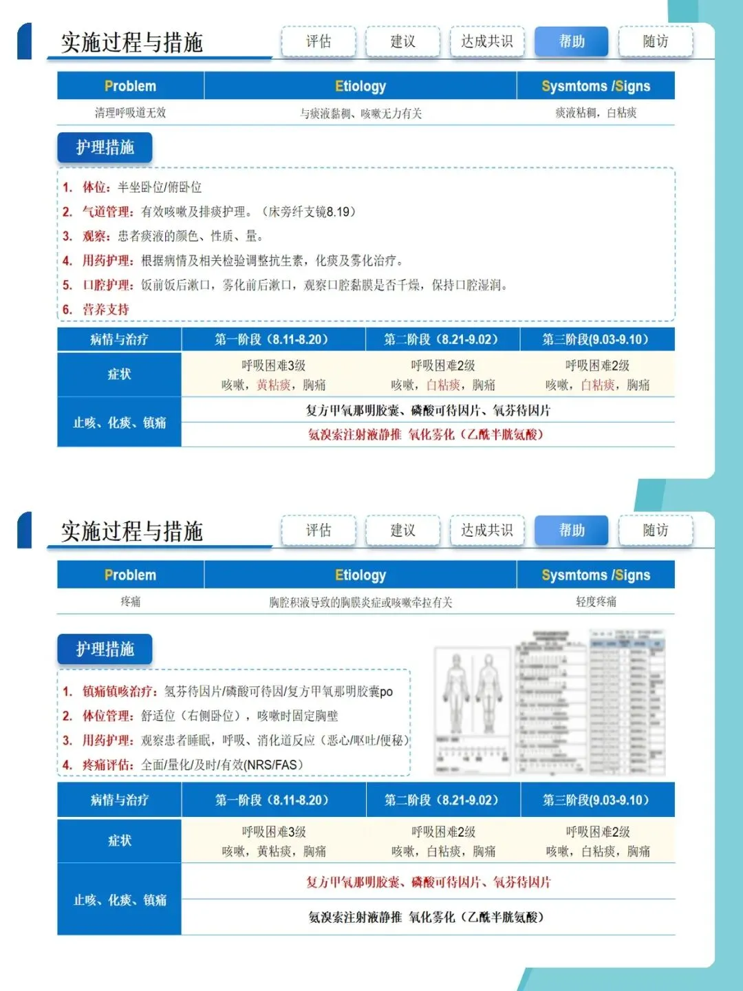 恶性胸腔积液是晚期肺癌患者最常见的并发症之一,严重影响患者生活质量和预后。本文通过一例60岁男性肺癌合并恶性胸腔积液患者的个案护理实践,系统阐述了基于5A护理模式(评估-建议-达成共识-帮助-随访)的全程护理干预策略。该案例涵盖疾病背景、发病机制、临床表现、治疗原则及多学科协作护理措施,重点展示了胸腔引流管护理、呼吸道管理、营养支持及并发症预防等核心内容,旨在为临床护理人员提供循证护理参考,提升晚期肺癌合并恶性胸腔积液患者的护理质量与生存质量。恶性胸腔积液(MPE)是指原发胸膜恶性肿瘤或其他部位恶性肿瘤转移至胸膜引发的胸膜腔积液。肺癌是导致MPE最常见的病因,约占所有MPE的1/3。合并MPE的肺癌患者中位生存期仅7.7个月,远低于未合并者的17.7个月,是预后不良的重要标志。肿瘤直接侵犯胸膜、淋巴回流受阻、毛细血管通透性增加是主要发病机制。患者常出现进行性呼吸困难(50%患者首发症状)、刺激性咳嗽、胸痛及全身消耗症状。根据积液量可分为少量(<500ml)、中量(500-1000ml)和大量(>1000ml)三级。超声、CT及胸腔穿刺活检是主要诊断手段。治疗遵循全身治疗为基石,局部治疗为辅助原则:首选超声引导下胸腔穿刺置管引流,首次引流量控制在600-1000ml;配合胸膜腔药物灌注(如恩度)及胸膜固定术;同时积极抗感染、纠正低蛋白血症和电解质紊乱。评估(Assess):全面评估患者呼吸功能(SpO₂ 85%→93%)、营养状况(白蛋白27-34g/L)、自理能力(Barthel指数75分)及并发症风险(感染性休克、口腔黏膜损伤)。建议(Advise):制定个体化护理方案,包括半卧位/俯卧位改善通气、持续低流量吸氧、氨溴索+乙酰半胱氨酸化痰、人血白蛋白营养支持。达成共识(Agree):与患者及家属共同设定目标——短期改善呼吸功能、控制症状;长期预防并发症、提高生活质量。帮助(Assist):实施多学科协作护理:胸腔引流管护理(引流量2980ml)、床旁纤支镜吸痰、镇痛镇咳、口腔护理(复方氯己定漱口液)、出入量精细化管理(每日入量1800-4000ml)。随访(Arrange):出院后第1、3、7天电话随访,指导家庭氧疗、激素用药及10月10日返院复诊。关键提示:放射性肺炎高危人群(年龄>70岁、紫杉醇化疗史、肺功能差)需警惕刺激性干咳、低热、气短症状,早期识别、规范引流、全程护理是改善预后的关键。免责声明:文章只作同行从业者设计创意之用,不作任何就医指导和建议,文档内容仅供研究参考,作者不对文档的完整性、权威性及其观点立场正确性做任何保证或承诺!同时,文中部分图片及文字采自公共网络资源,版权归原作者所有,如有雷同或侵权,请第一时间联系删除。