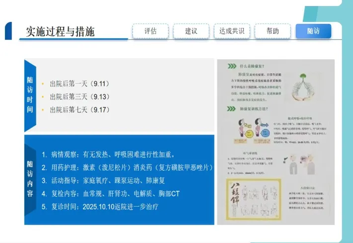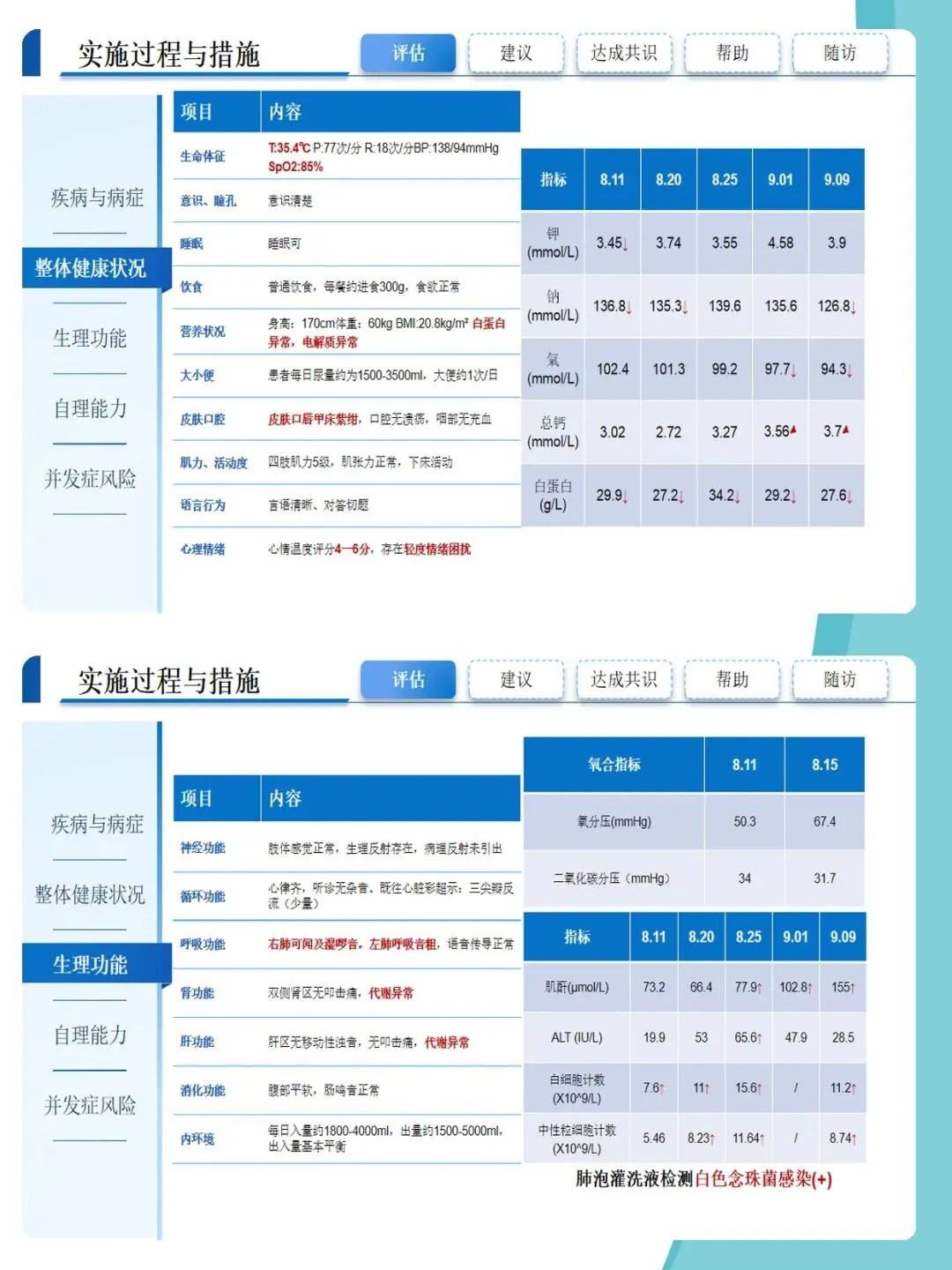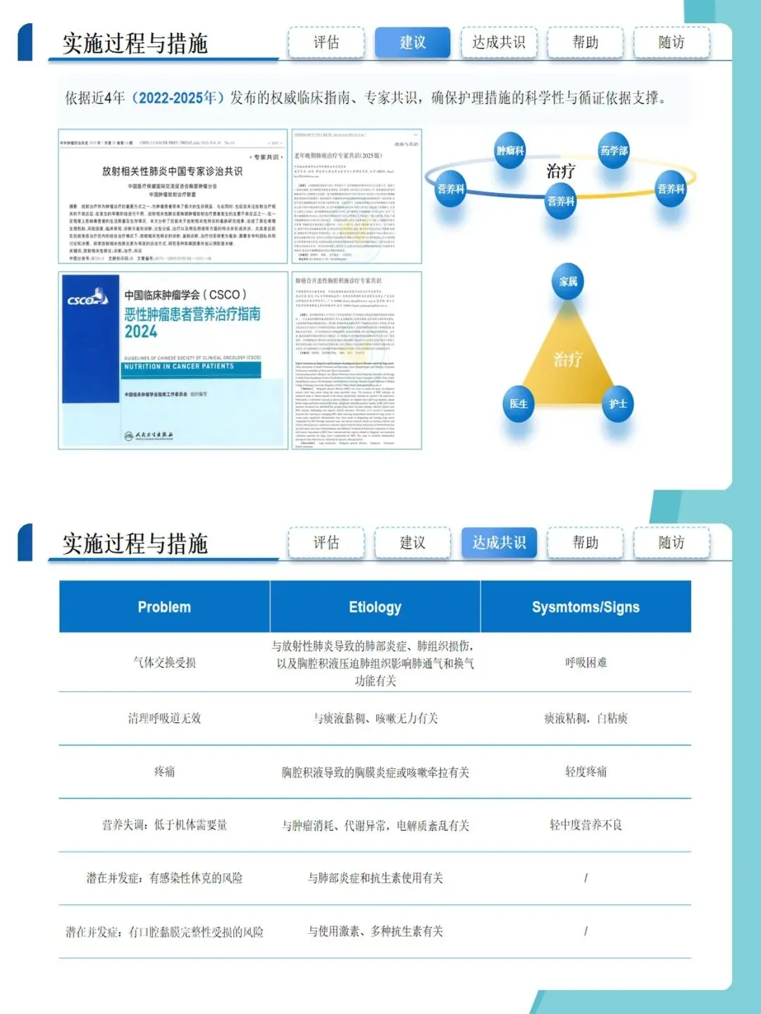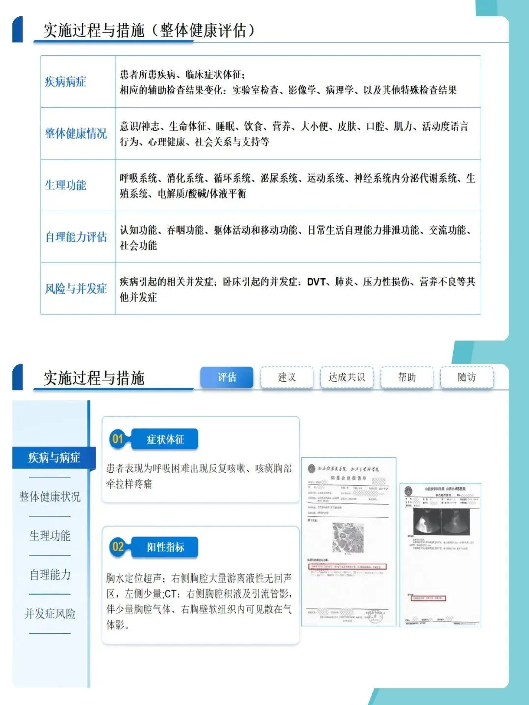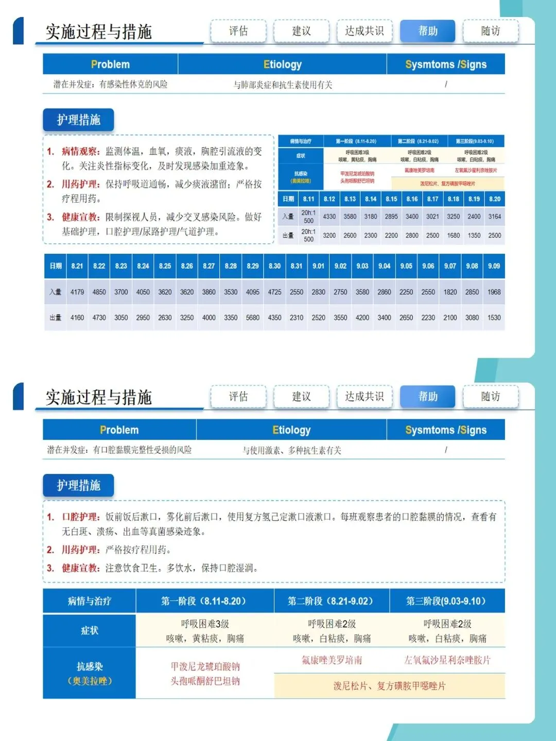 恶性胸腔积液是晚期肺癌患者最常见的并发症之一,严重影响患者生活质量和预后。本文通过一例60岁男性肺癌合并恶性胸腔积液患者的个案护理实践,系统阐述了基于5A护理模式(评估-建议-达成共识-帮助-随访)的全程护理干预策略。该案例涵盖疾病背景、发病机制、临床表现、治疗原则及多学科协作护理措施,重点展示了胸腔引流管护理、呼吸道管理、营养支持及并发症预防等核心内容,旨在为临床护理人员提供循证护理参考,提升晚期肺癌合并恶性胸腔积液患者的护理质量与生存质量。恶性胸腔积液(MPE)是指原发胸膜恶性肿瘤或其他部位恶性肿瘤转移至胸膜引发的胸膜腔积液。肺癌是导致MPE最常见的病因,约占所有MPE的1/3。合并MPE的肺癌患者中位生存期仅7.7个月,远低于未合并者的17.7个月,是预后不良的重要标志。肿瘤直接侵犯胸膜、淋巴回流受阻、毛细血管通透性增加是主要发病机制。患者常出现进行性呼吸困难(50%患者首发症状)、刺激性咳嗽、胸痛及全身消耗症状。根据积液量可分为少量(<500ml)、中量(500-1000ml)和大量(>1000ml)三级。超声、CT及胸腔穿刺活检是主要诊断手段。治疗遵循全身治疗为基石,局部治疗为辅助原则:首选超声引导下胸腔穿刺置管引流,首次引流量控制在600-1000ml;配合胸膜腔药物灌注(如恩度)及胸膜固定术;同时积极抗感染、纠正低蛋白血症和电解质紊乱。评估(Assess):全面评估患者呼吸功能(SpO₂ 85%→93%)、营养状况(白蛋白27-34g/L)、自理能力(Barthel指数75分)及并发症风险(感染性休克、口腔黏膜损伤)。建议(Advise):制定个体化护理方案,包括半卧位/俯卧位改善通气、持续低流量吸氧、氨溴索+乙酰半胱氨酸化痰、人血白蛋白营养支持。达成共识(Agree):与患者及家属共同设定目标——短期改善呼吸功能、控制症状;长期预防并发症、提高生活质量。帮助(Assist):实施多学科协作护理:胸腔引流管护理(引流量2980ml)、床旁纤支镜吸痰、镇痛镇咳、口腔护理(复方氯己定漱口液)、出入量精细化管理(每日入量1800-4000ml)。随访(Arrange):出院后第1、3、7天电话随访,指导家庭氧疗、激素用药及10月10日返院复诊。关键提示:放射性肺炎高危人群(年龄>70岁、紫杉醇化疗史、肺功能差)需警惕刺激性干咳、低热、气短症状,早期识别、规范引流、全程护理是改善预后的关键。免责声明:文章只作同行从业者设计创意之用,不作任何就医指导和建议,文档内容仅供研究参考,作者不对文档的完整性、权威性及其观点立场正确性做任何保证或承诺!同时,文中部分图片及文字采自公共网络资源,版权归原作者所有,如有雷同或侵权,请第一时间联系删除。