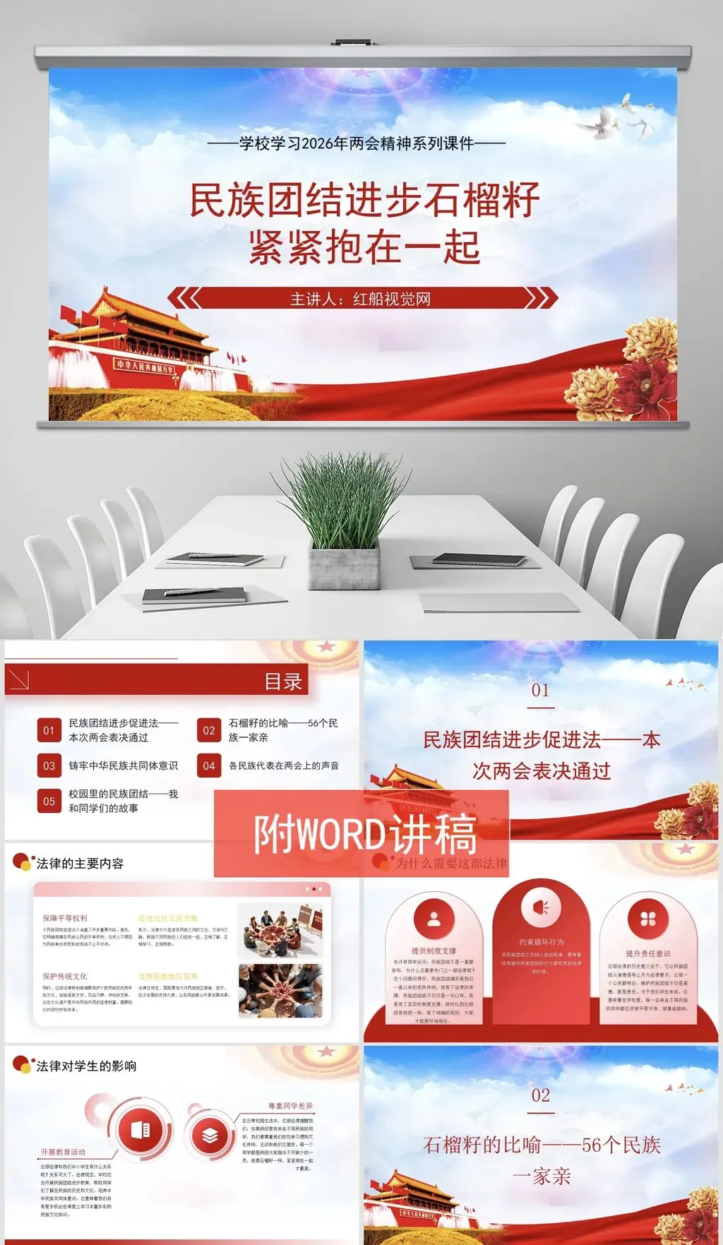 本课件主要内容为2026两会精神进校园民族团结进步石榴籽紧紧抱在一起主题教育PPT,讲稿字数:5237字。