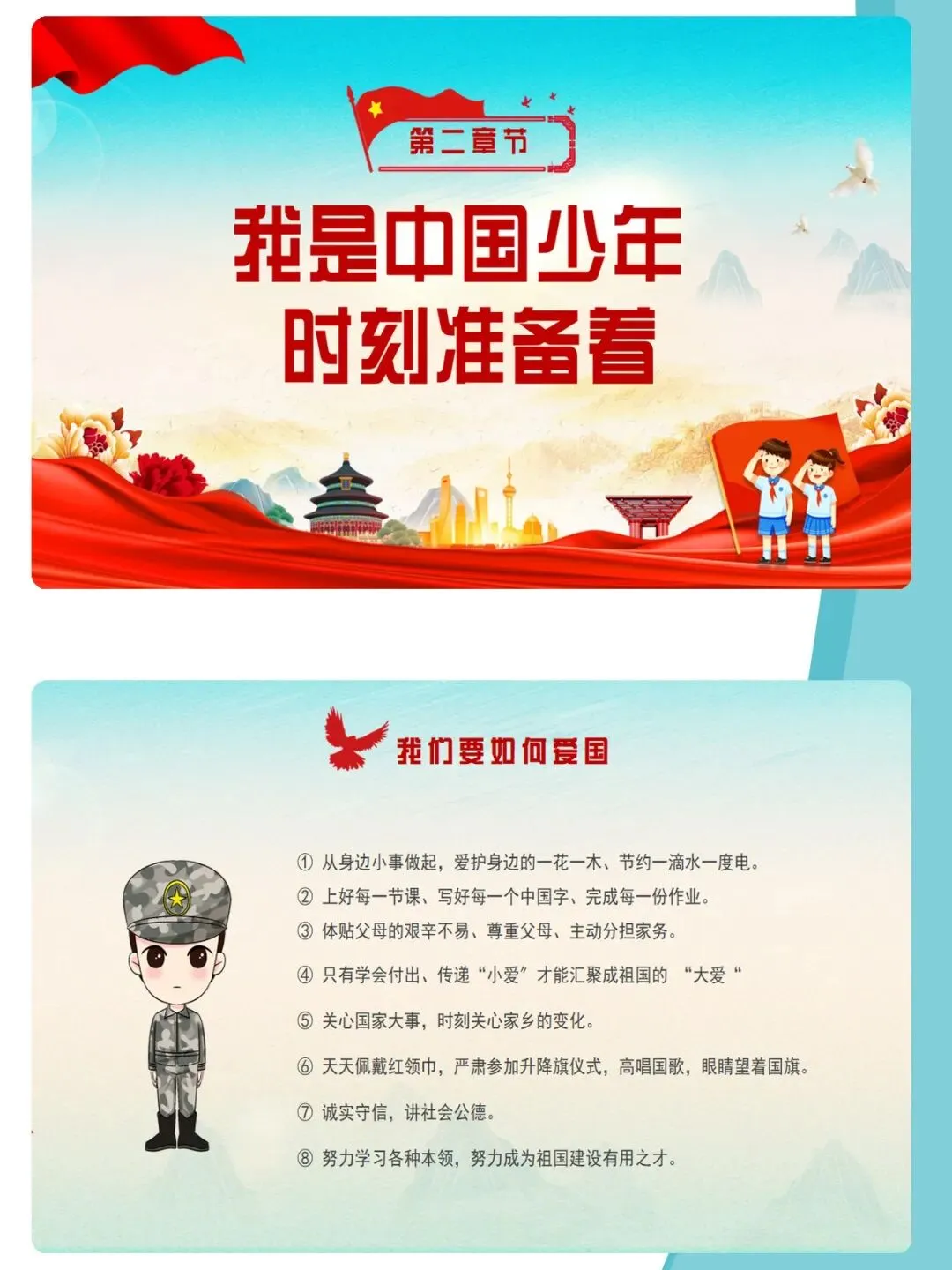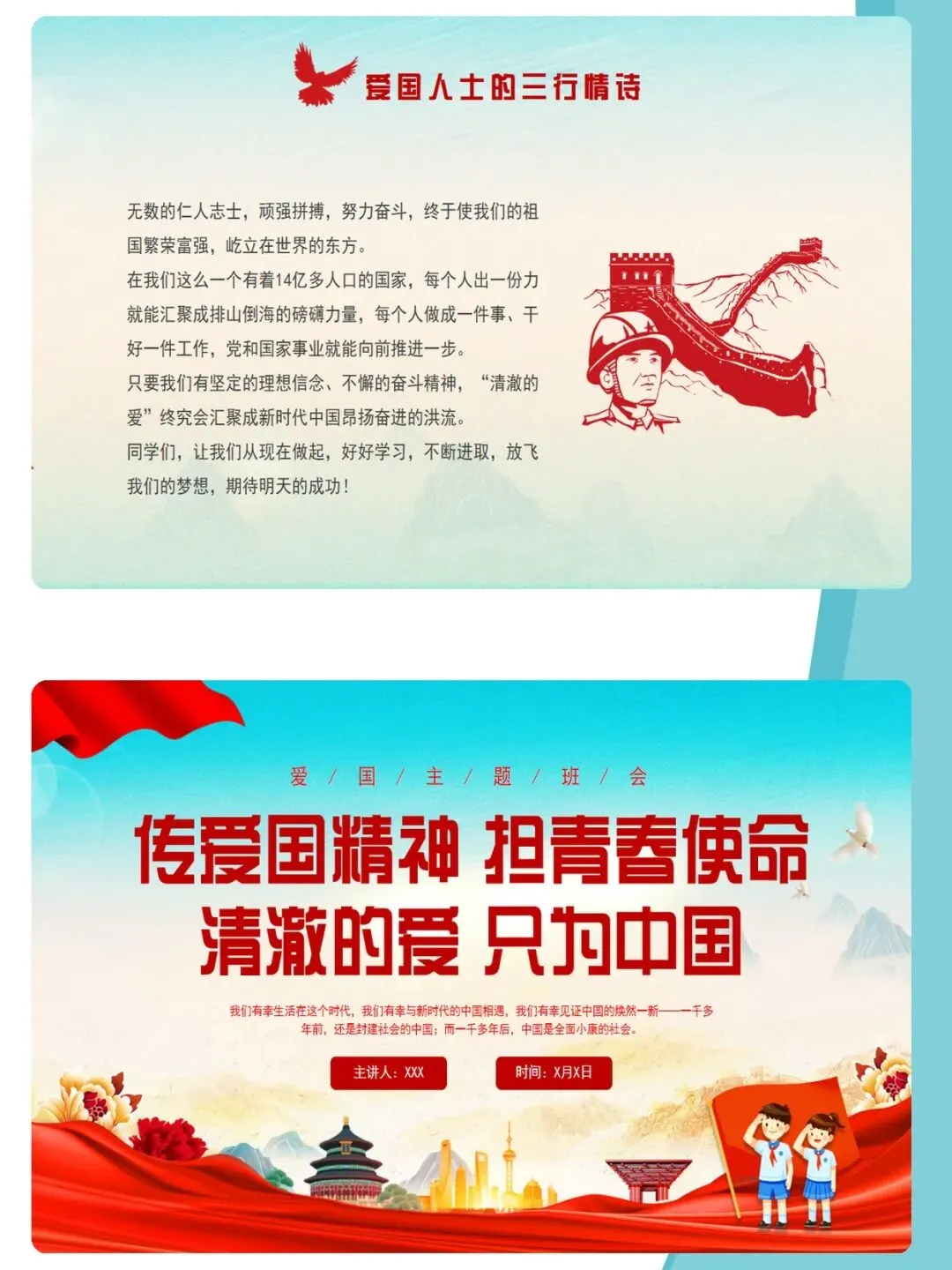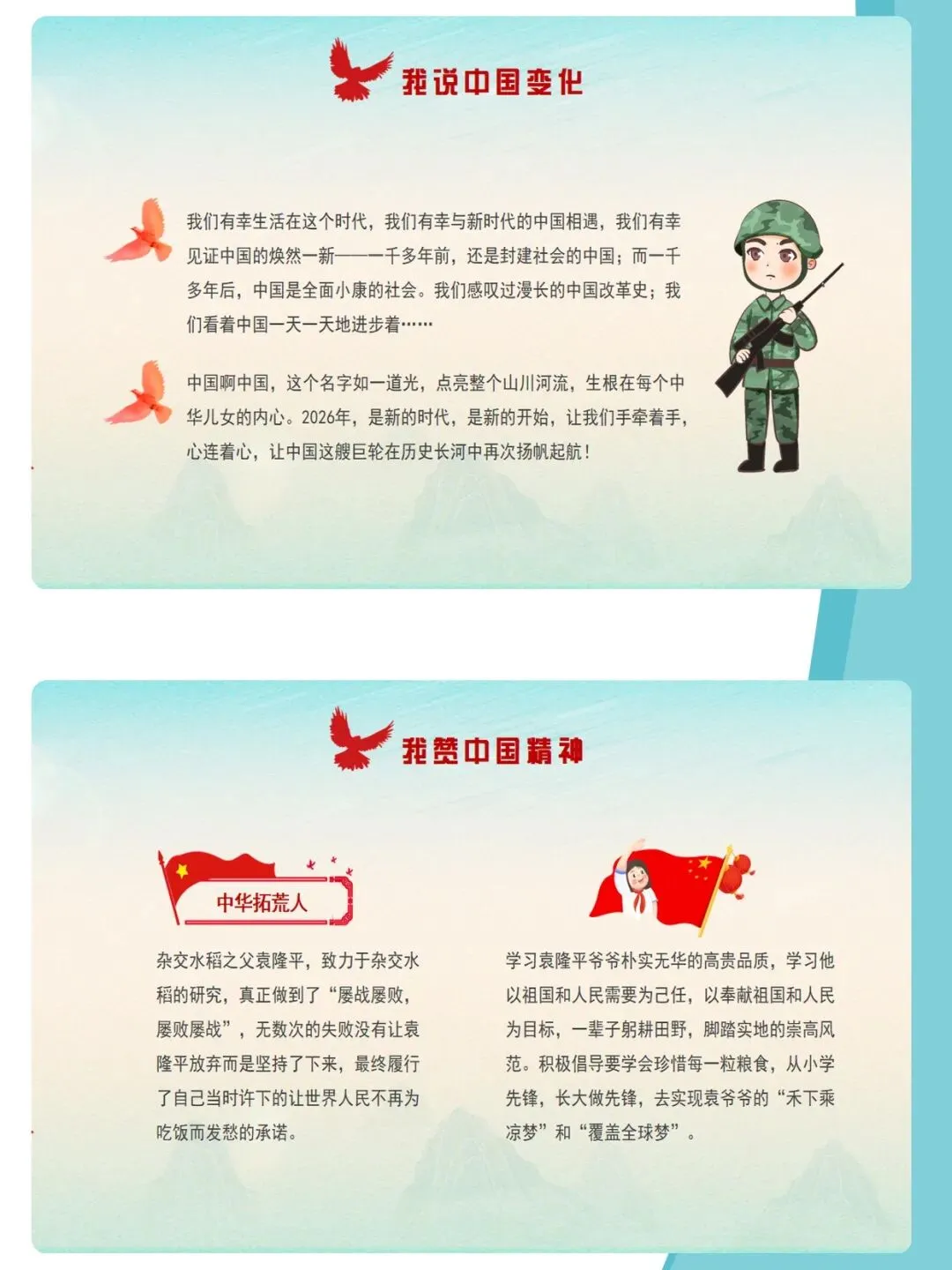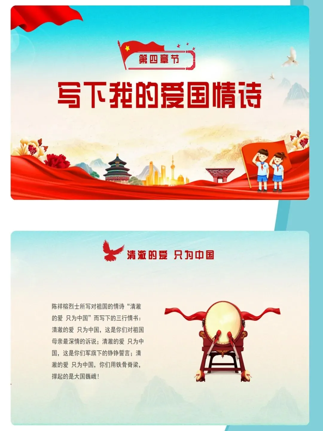 爱国主义,是中华民族精神的核心,是流淌在每一个中国人心中的热血与信仰。课件通过梳理新中国成立76年来的辉煌历程,结合袁隆平、中国航天人、卫国戍边英雄等时代楷模的感人事迹,深刻诠释“清澈的爱,只为中国”这一动人誓言。文章从历史回望、榜样力量、青春担当三个维度,引导青少年厚植家国情怀,树立远大理想,在新时代的征程中,以青春之我,建设青春之中国。