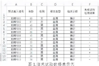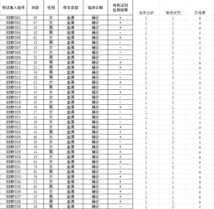 以申报试剂对临床诊断结果的灵敏度、特异度为例,我们探讨如何利用Excel进行临床试验数据分析。临床试验数据表通常包含受试者(样本)编号、年龄、性别、样本类型、临床诊断结果以及考核试剂的检测结果等多项数据列。临床诊断结果和考核试剂的检测结果通常以文本格式记录,但需要转换为“0/1”以进行有效的数学运算和条件判断。