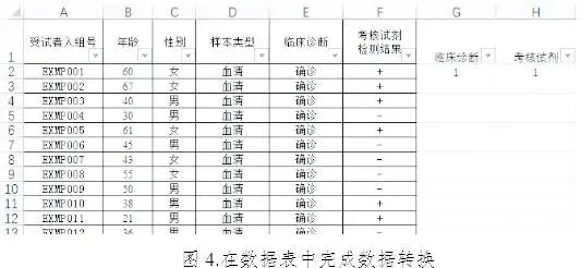 在Excel中,我们按照类似的方式,对考核试剂的检测结果也进行“0/1”转换。通过筛选功能,我们可以清晰地看到考核试剂的检测结果以“+/-”符号进行呈现。我们可以在诊断转换结果列的右侧再新增一列,命名为“考核试剂检测结果”转换。接着,在对应数据首行的单元格中输入公式“=IF(F2="+",1,0)”,这样就能将考核试剂的检测结果有效地转换为“0/1”形式。