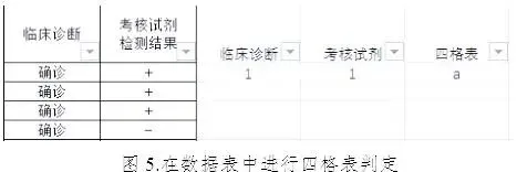 依据四格表的定义,我们对经过转换的临床诊断结果与考核试剂的检测结果进行判定。在数据表格的右侧,我们新增了一列用于“四格表”的判定。在对应数据首行的单元格中,我们运用公式来表示上述的判定规则: