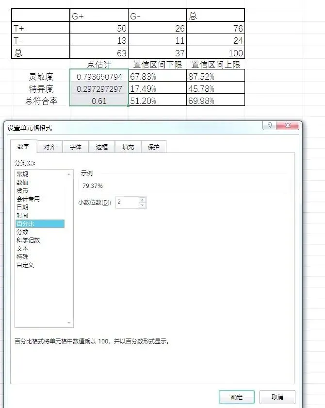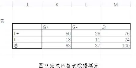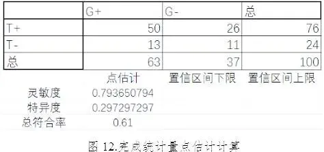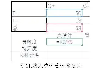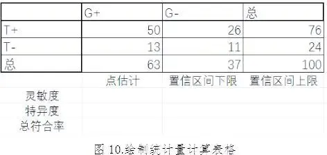 接下来,我们需要在数据表的适当空白位置绘制一个四格表。这个四格表将用于呈现和分析数据,帮助我们更好地理解和利用数据。其中,G表示临床诊断结果,T代表考核试剂的检测结果。在数据表中创建四格表来汇总不同检测结果的数量,便于分析。