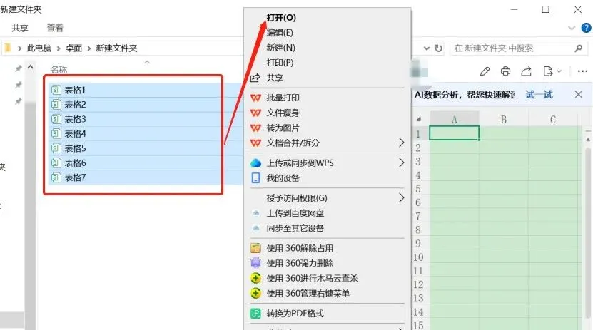 首先,用鼠标拖选或按快捷键Ctrl+A全选所有文件,如下图所示表格1至表格7,然后直接按下Enter键,系统就会自动依次打开所有选中的表格。