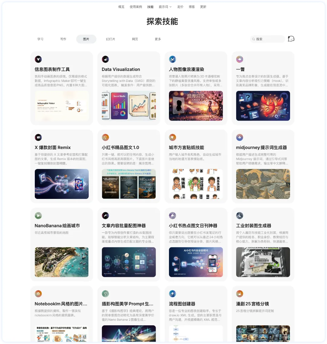 YouMind 有超级丰富的 Skills 社区生态,我们可以在 Skills 社区里看到许多优秀的生图 和 PPT Skills。