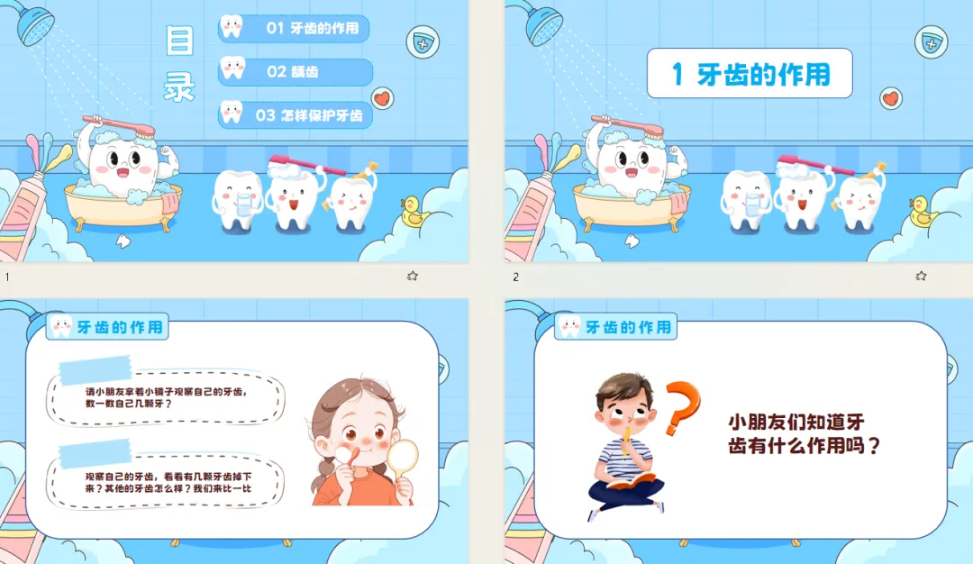 引导语:牙齿的本领很大,你们知道它有什么本领吗? 每颗牙齿都一样吗?它们都有什么样子? 它会一直住在你们的嘴巴里吗?