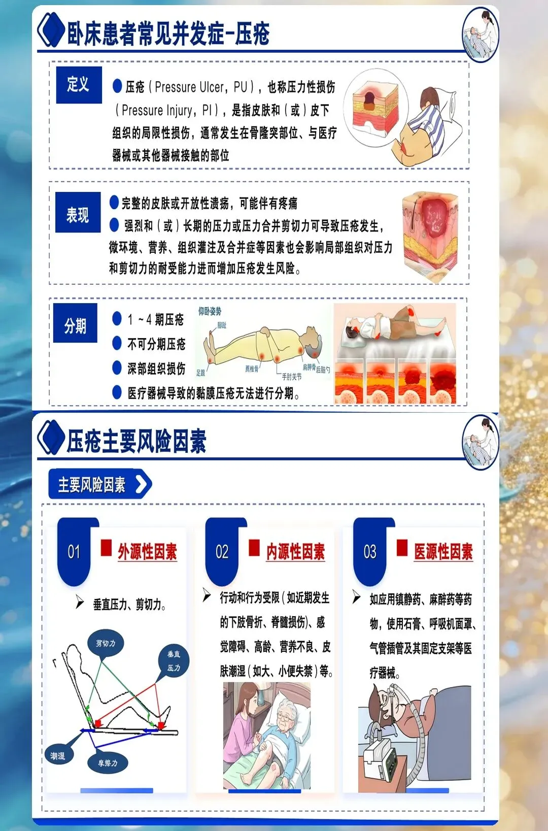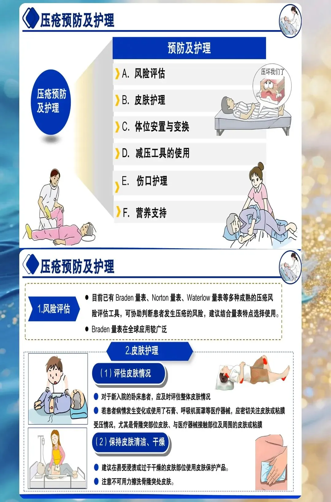 压疮的预防要从评估开始,不能等到压疮出现了才去处理。护理团队对每个卧床患者都进行压疮风险评估,评估量表有很多,但不能只看分数。要结合患者的年龄、营养状况、活动能力、感知能力、潮湿程度等因素综合判断。很多人不知道的是,压疮形成的本质是局部组织缺血缺氧,压力和剪切力是主要因素。护理团队根据评估结果制定了个性化的预防方案,包括减压设备的选择、翻身频率的确定、营养支持的方案等。高风险患者要使用动态气垫床,低风险患者普通床垫配合翻身即可。很多人以为气垫床万能,其实低风险患者使用气垫床是资源浪费,高危患者使用普通气垫床又达不到预防效果。