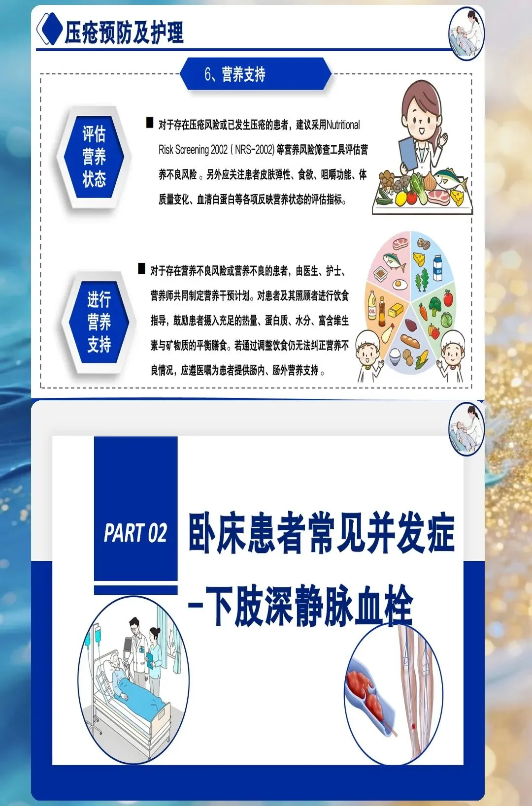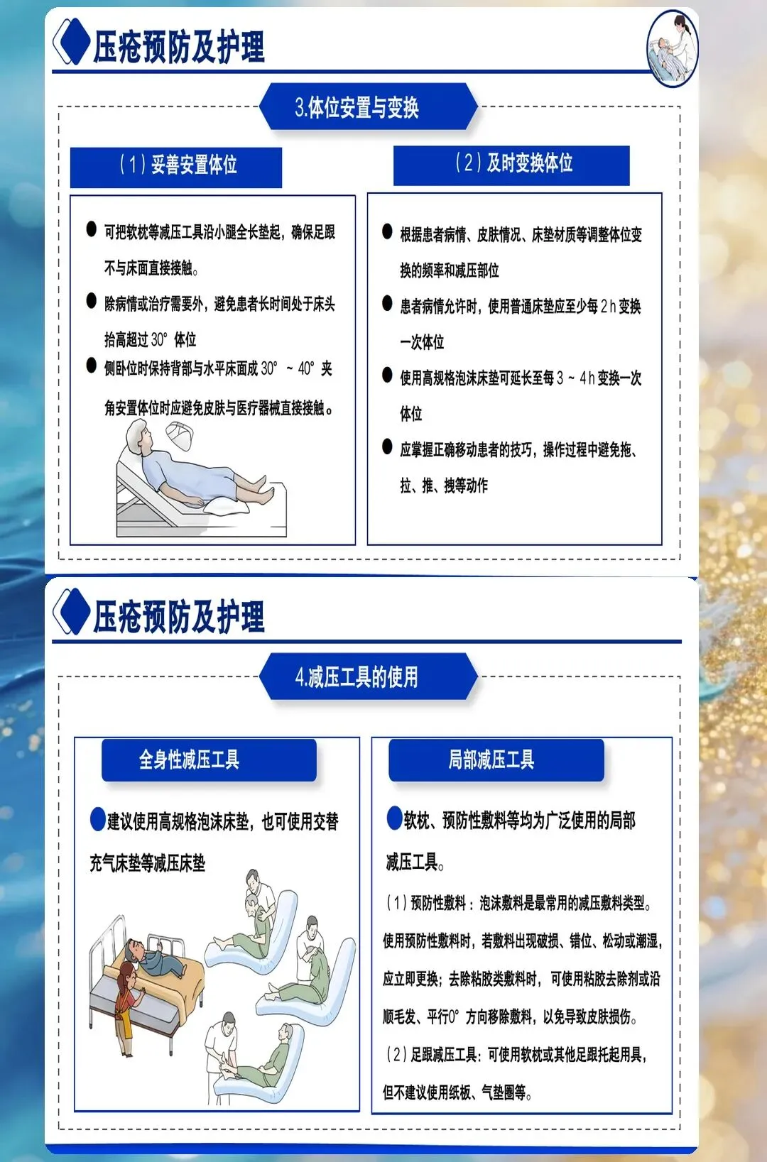 翻身技巧很多人都会,但细节容易被忽视。翻身不是简单地把患者翻过来,要采用轴线翻身法,保持头颈躯干在一条线上转动。很多人不知道的是,翻身时间不是固定的两小时,要根据患者情况动态调整。使用减压床垫的患者可以延长到三到四小时翻身一次,而营养不良、水肿明显的患者可能需要每小时翻身。翻身时要注意观察皮肤情况,特别是骨隆突处,如骶尾部、股骨大转子、足跟等部位。这个患者在住院期间护理团队每班检查皮肤完整性,及时发现了一期压疮红斑,采取减压措施后很快消退。很多人忽视了翻身时间的选择,避开饭后一小时内和血压波动明显的时段,这样能减少不适和风险。
