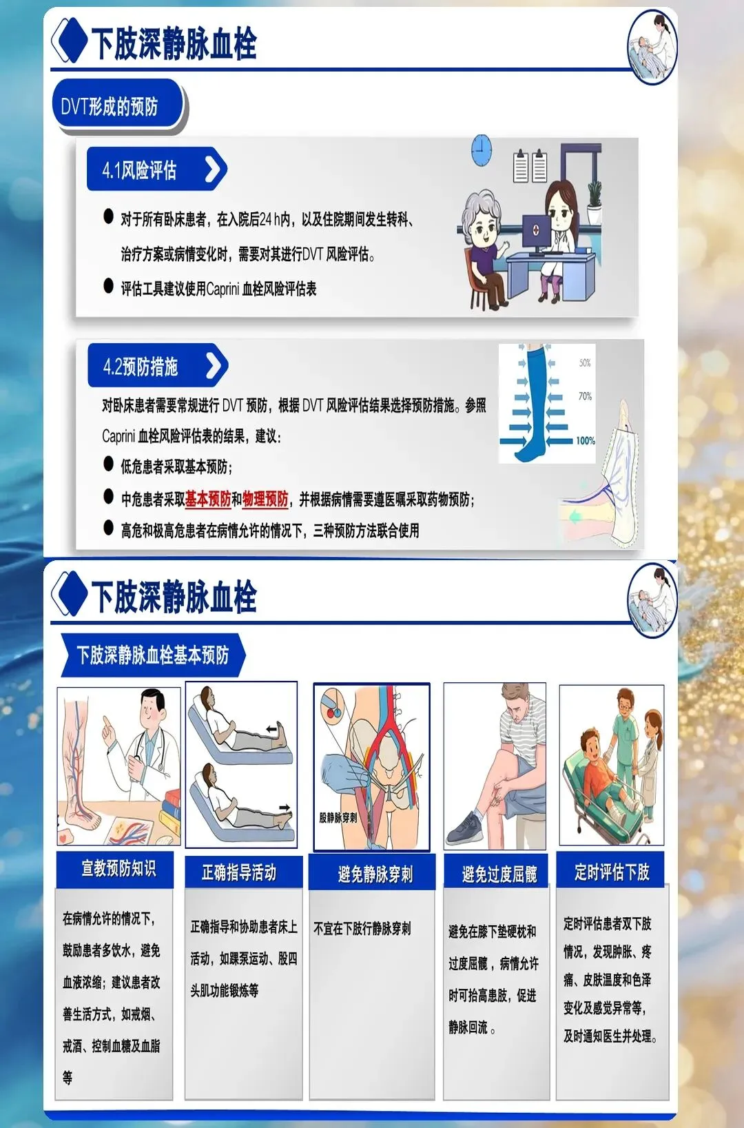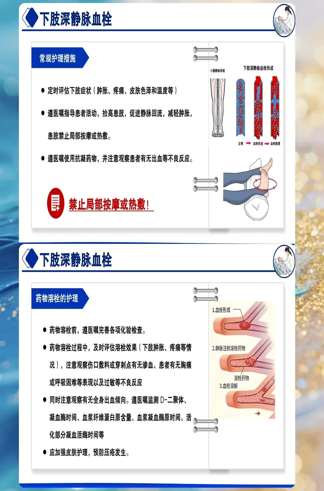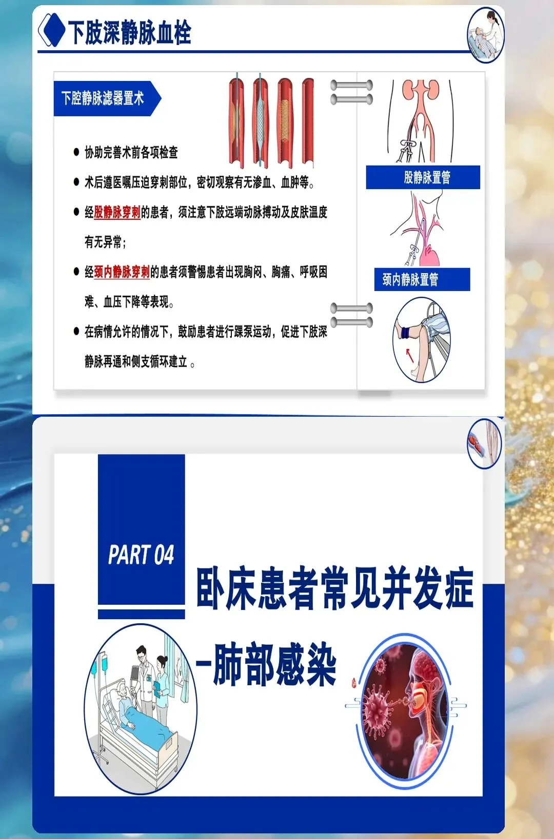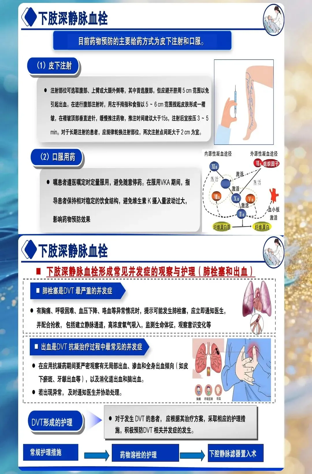 深静脉血栓的预防要采取综合措施。很多人认为只要用弹力袜或者气压泵就能预防,其实物理预防和药物预防要结合使用。护理团队根据患者的出血风险和血栓风险制定了个体化的预防方案。出血风险高的患者主要采用物理预防,包括间歇充气加压装置和梯度压力弹力袜。出血风险低的患者可以在物理预防基础上加用低分子肝素皮下注射。很多人不知道的是,深静脉血栓的临床表现不典型,很多患者没有明显肿胀,只表现为轻微疼痛或发热。护理团队每天测量双侧下肢周径,对比有无不对称性肿胀,一旦发现异常立即通知医生。这个患者住院期间出现了轻微的左下肢肿胀,及时使用抗凝药物后血栓没有进一步发展。