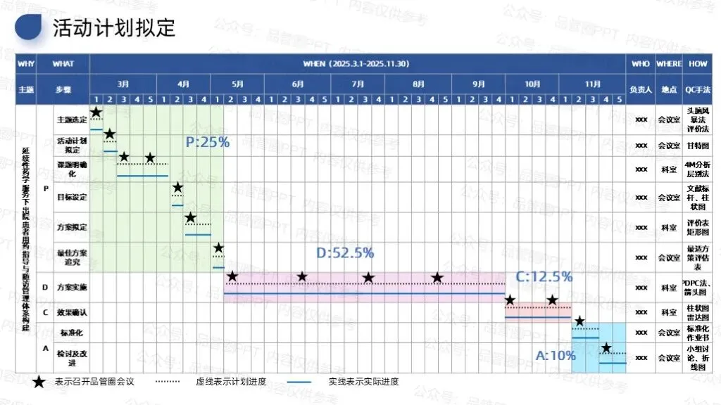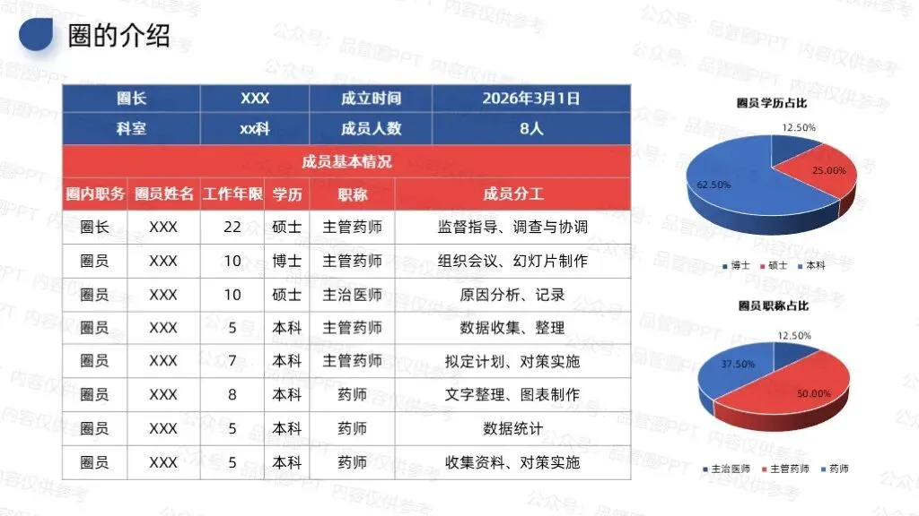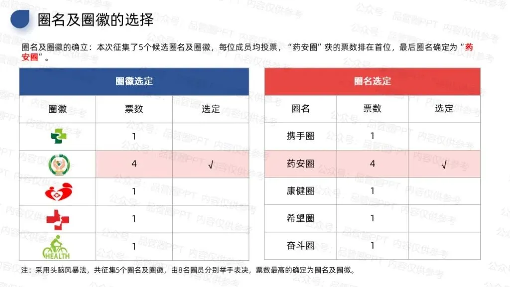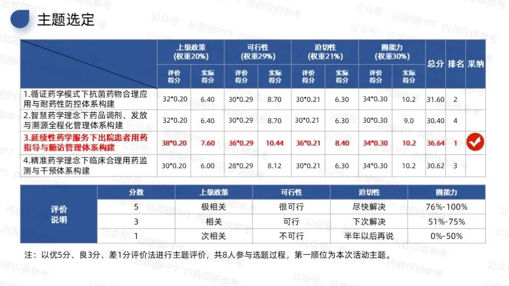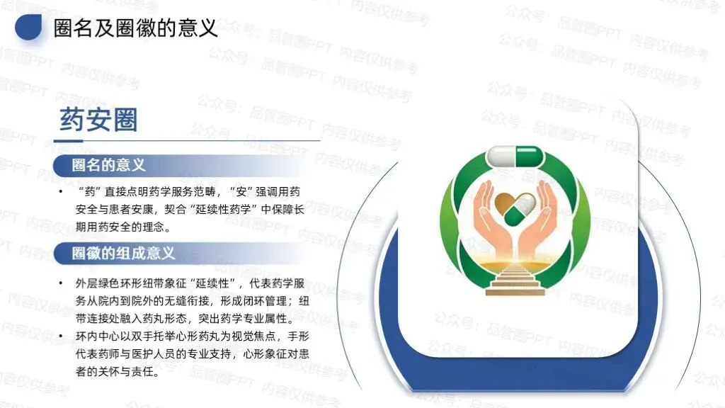 成立 8 人品管圈,全力构建出院患者用药指导与随访管理体系。本次征集了5个候选圈名及圈徽,每位成员均投票,“药安圈”获的票数排在首位,最后圈名确定为“药安圈”。外层绿色环形纽带象征“延续性”,代表药学服务从院内到院外的无缝衔接,形成闭环管理;纽带连接处融入药丸形态,突出药学专业属性。环内中心以双手托举心形药丸为视觉焦点,手形代表药师与医护人员的专业支持,心形象征对患者的关怀与责任。开展会议,聚焦延续性药学服务,选定“构建出院患者用药指导与随访管理体系,为患者康复之路保驾护航”主题,助力患者出院后科学用药、顺利康复。