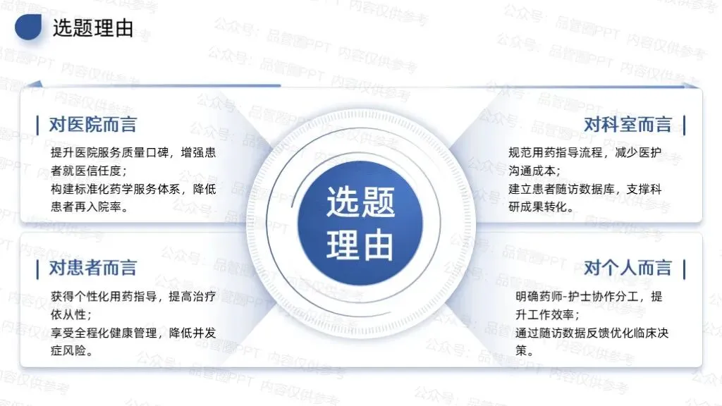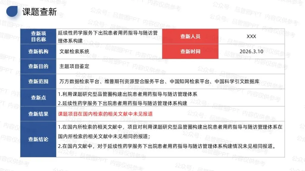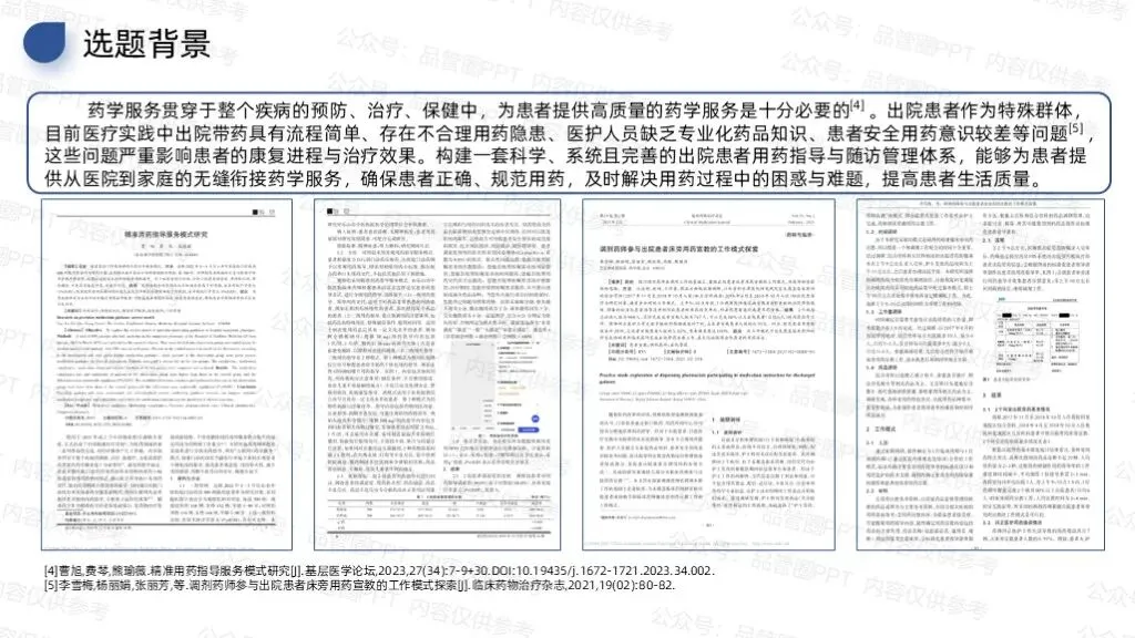 利用课题研究型品管圈构建出院患者用药指导与随访管理体系,能通过系统、规范且持续的药学服务,为患者提供个性化的用药教育、精准的用药提醒以及及时的用药问题解答,确保患者在出院后仍能获得专业药学支持,提高用药合理性与安全性,减少因用药不当导致的疾病复发与再入院率,进而提升患者生活质量,减轻社会医疗负担,具有重要的现实意义与临床价值。