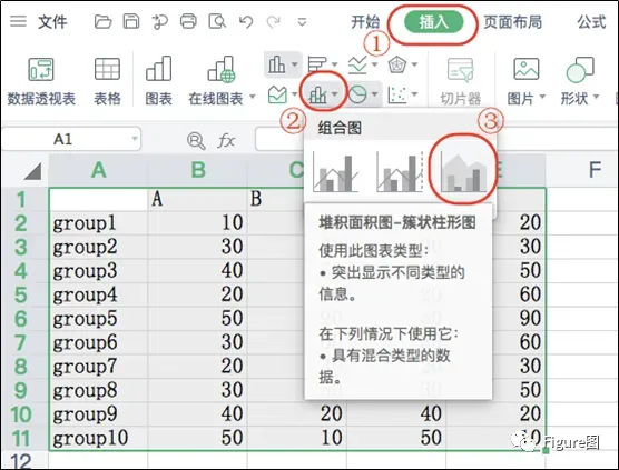 2.选中数据,依次点击“插入”→“组合图”→“簇状柱形图-面积图”,插入图表。