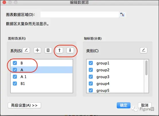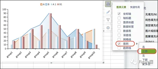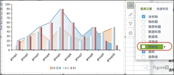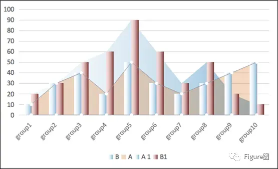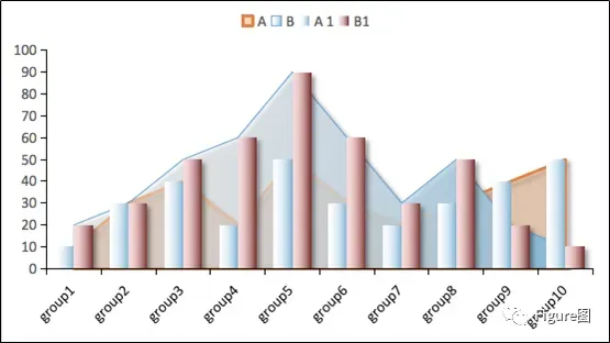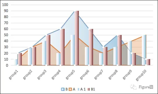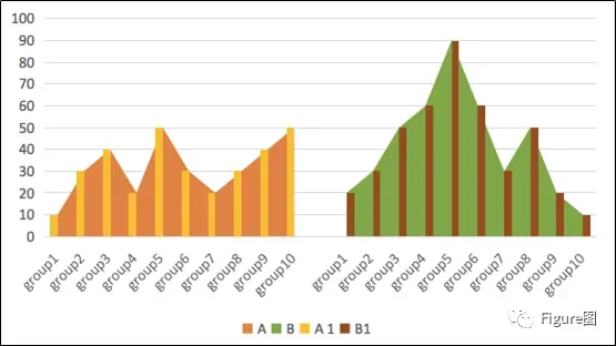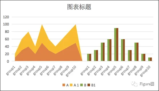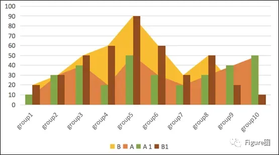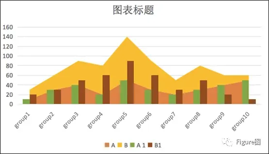 6. 修改后的四个系列便两两对应了,但是这里我们发现数值较高的A把B的面积图几乎均遮住了,所以先调整它们的顺序: