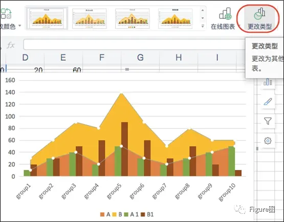 4. 不过现在显示的面积图为堆积面积图,所以我们需要将其改为面积图。通过菜单栏的“更改类型”进行调整。