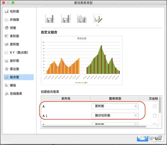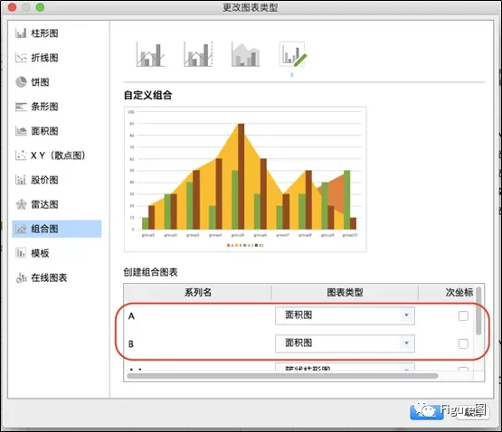 5. 在弹出的“更改图表类型”对话框中重新将A、B的类型改为“面积图”,不用选择次坐标。