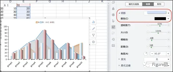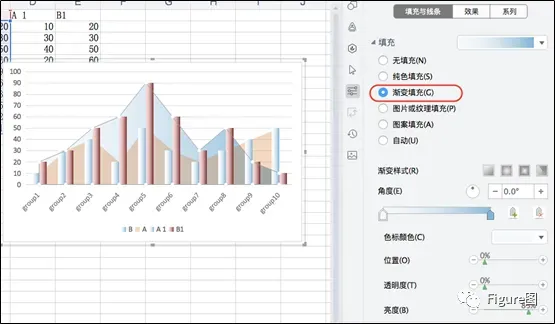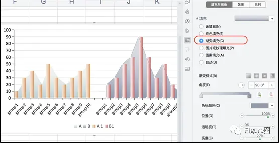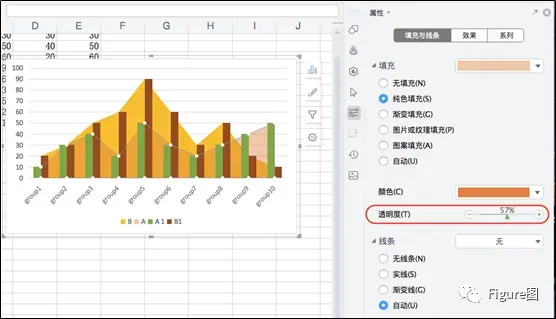 9.所以我们进一步调整面积图的透明度,使两个系列都能看清(也可以一开始不调整顺序,直接调节面积图透明度,也能达到一样的效果)。