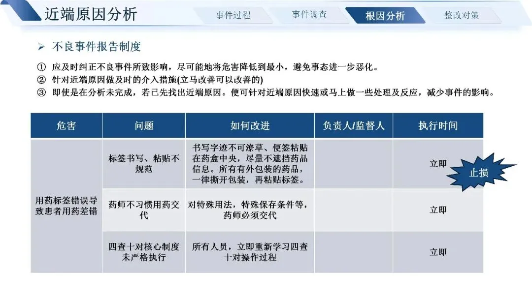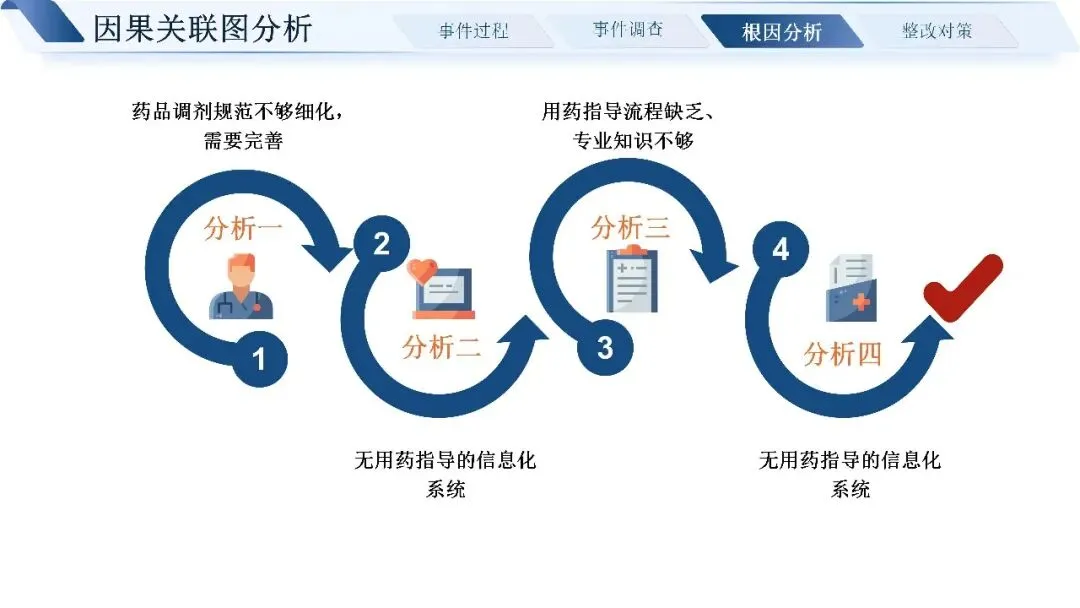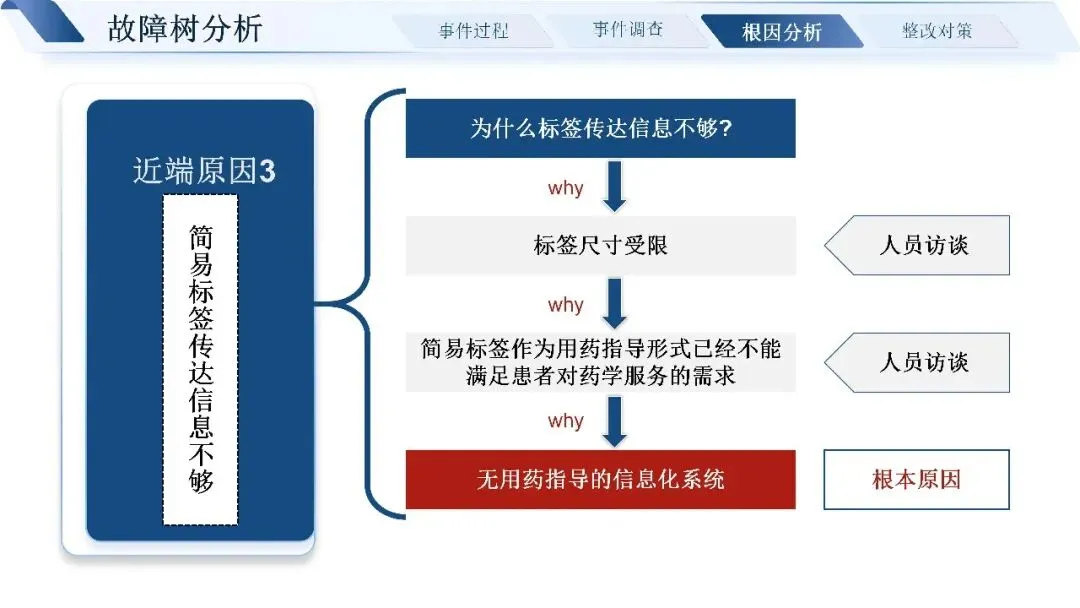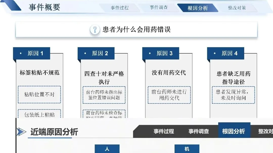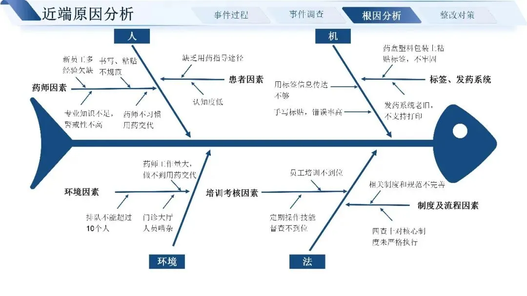 通过层层追溯,我们找到了问题的近端原因:标签书写粘贴不规范,四查十对制度未严格执行,药师未做好用药交代,患者也缺乏有效的用药指导途径。深挖根本原因,核心还是制度流程不完善、发药系统老旧、药师培训考核不到位、门诊环境工作量大等多重因素叠加。