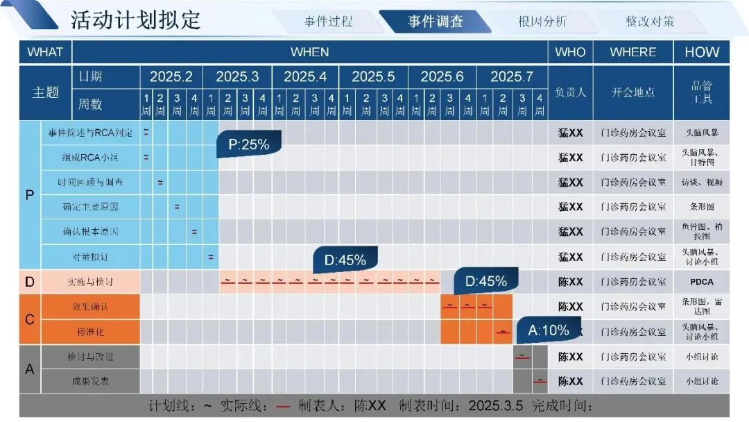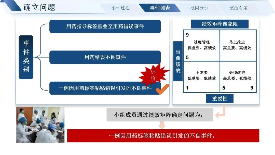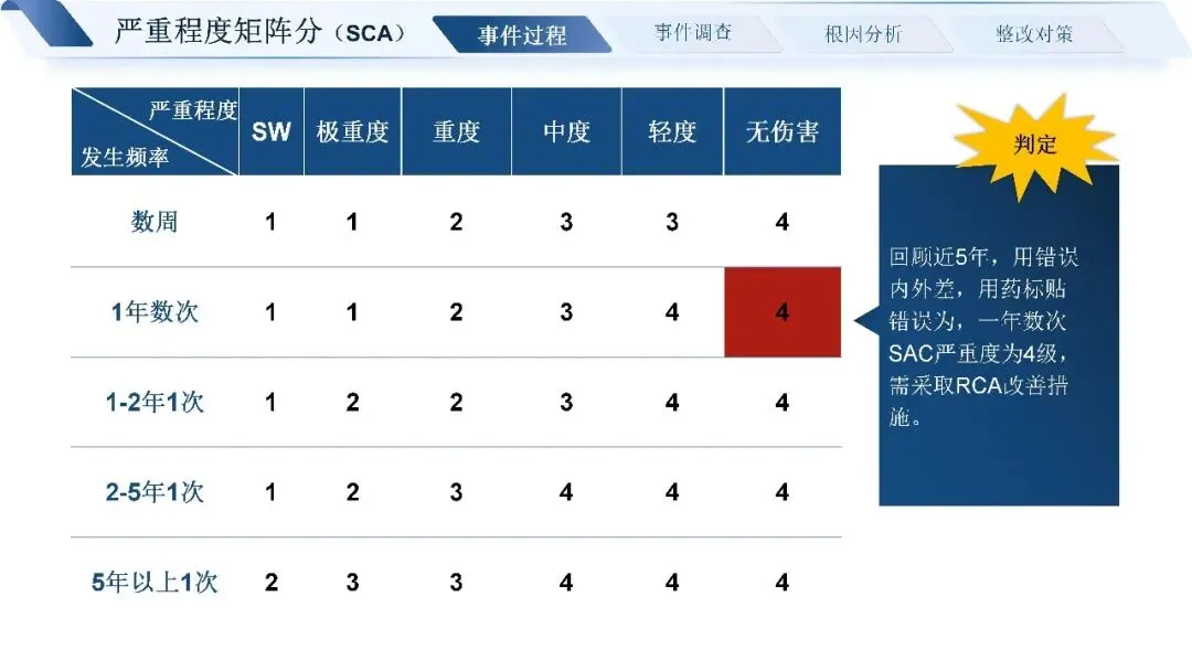 这次的不良事件,起因是患者取药后,药品包装盒上有两个重叠的用法标签,正确标签被覆盖,导致患者服药剂量错误。发现问题后,我们第一时间成立了 RCA 分析团队,通过事件调查、IDT 决策树判断、严重程度矩阵分析,确定这是一起需要重点整改的系统类问题,而非个人刻意行为。