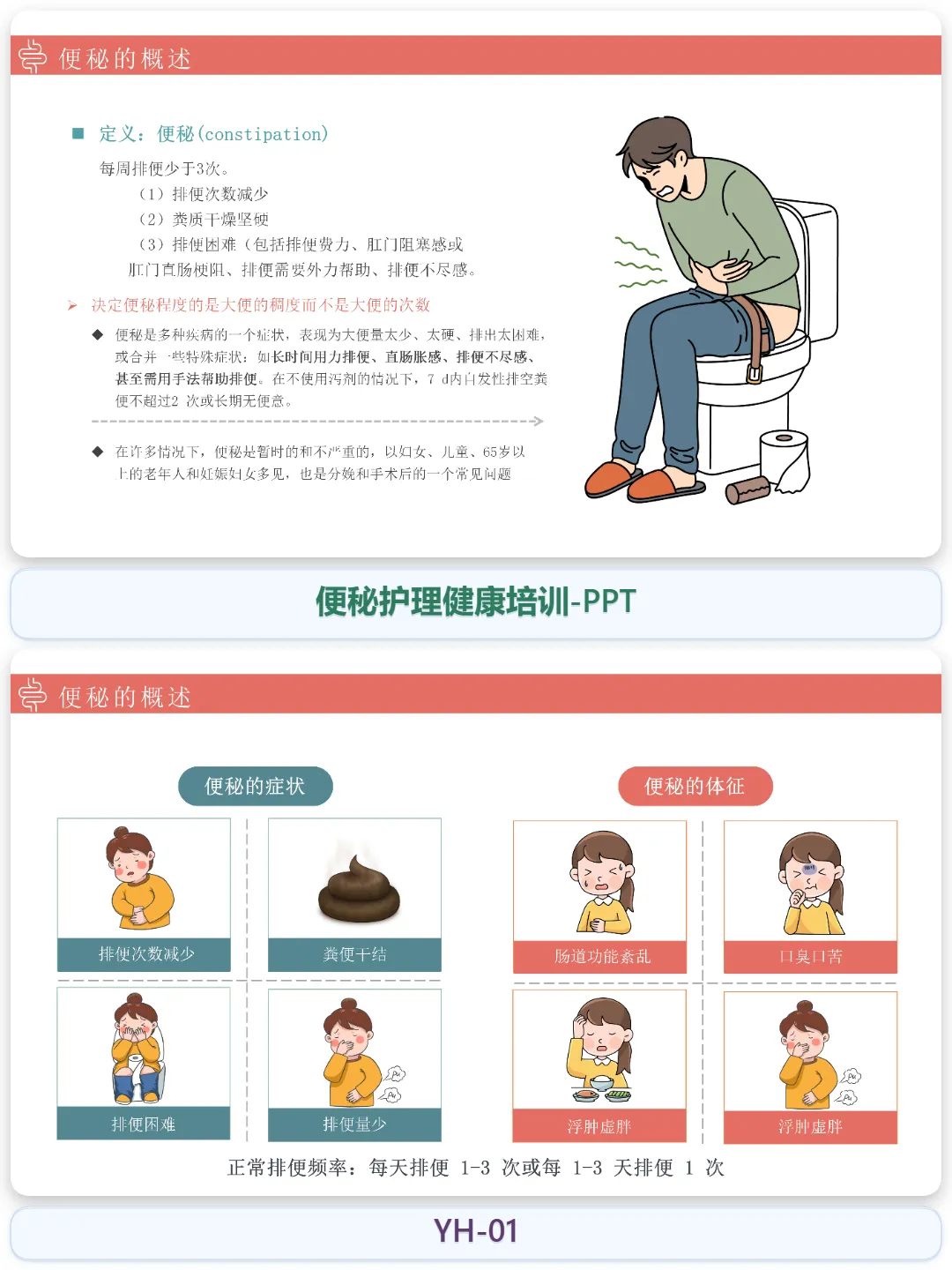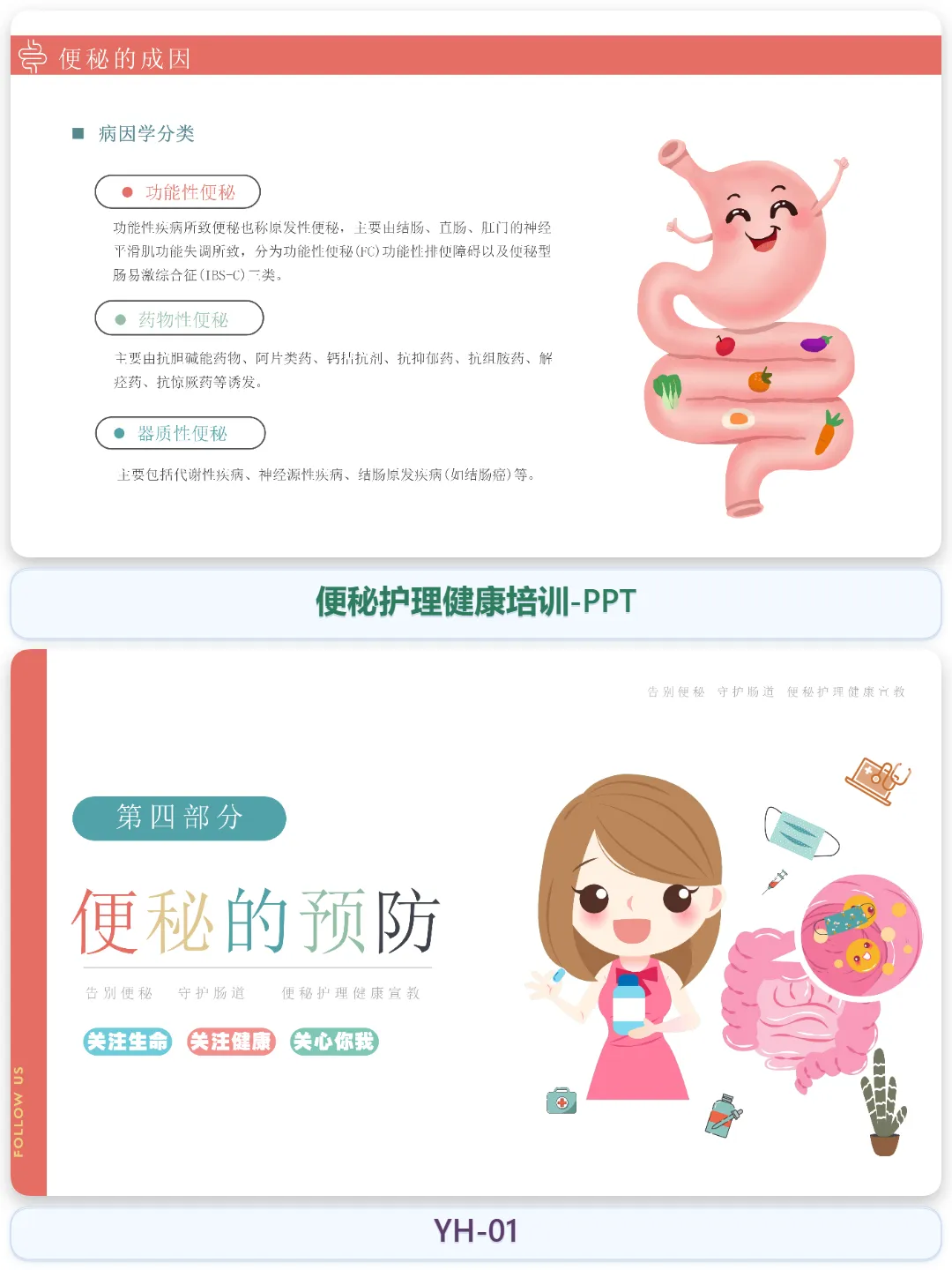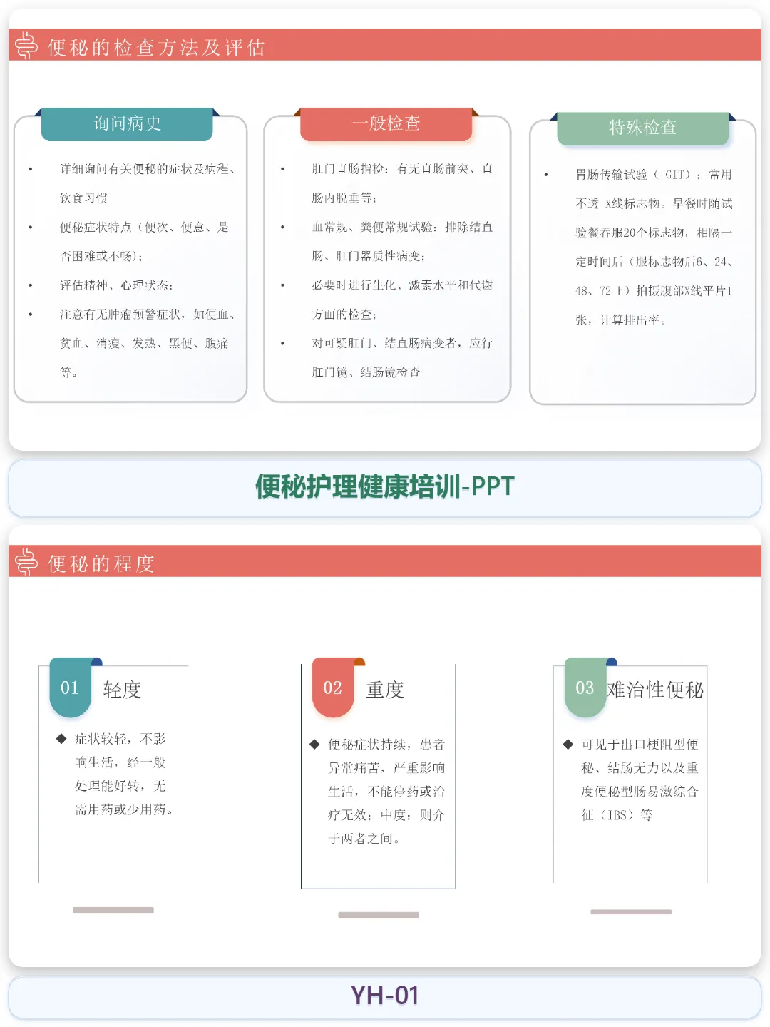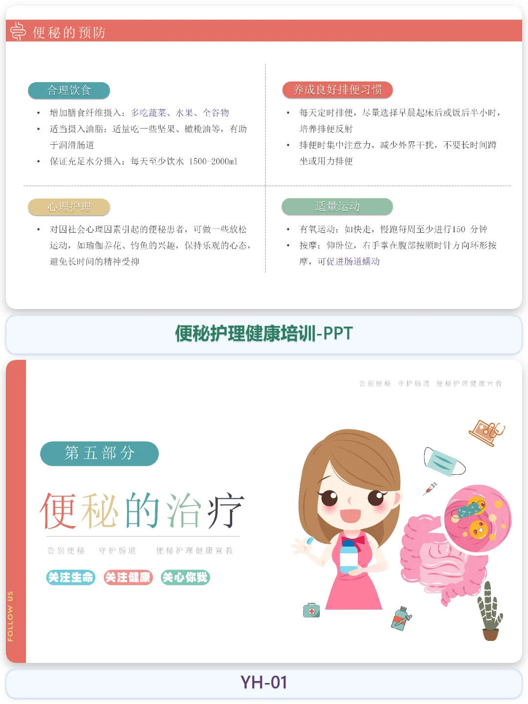 这份医护专属PPT,直接套用,省心高效,贴合临床工作需求。✅ PPT主题便秘护理健康培训:科学养护肠道,告别排便难题✅ 适用人群临床医护人员、规培实习生、科室宣教及管理相关人员✅ 核心亮点1. 专业合规:紧扣临床规范与诊疗指南,内容严谨,贴合工作实际2. 逻辑清晰:框架规整,重点突出,图文搭配易懂,讲解展示更顺畅3. 版式简约:医疗风简约排版,无花哨设计,投屏打印都合适4. 可编辑修改:全套可微调,适配多场景,灵活复用📸 内页节选展示
