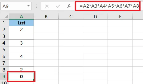 如果在其中某个空单元格中输入 0,结果就变成了 0。