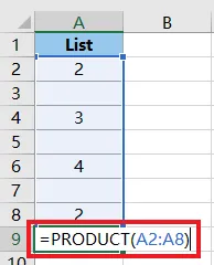 如果用公式 =PRODUCT(A2:A8) 的话,结果则变成了 48。