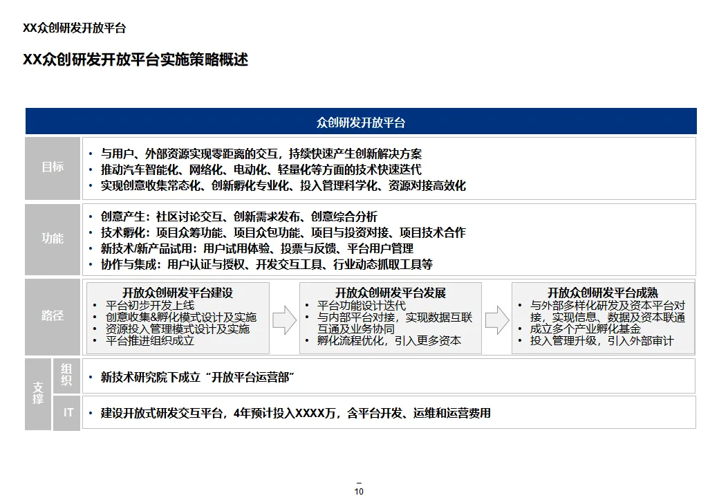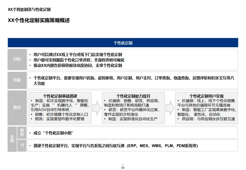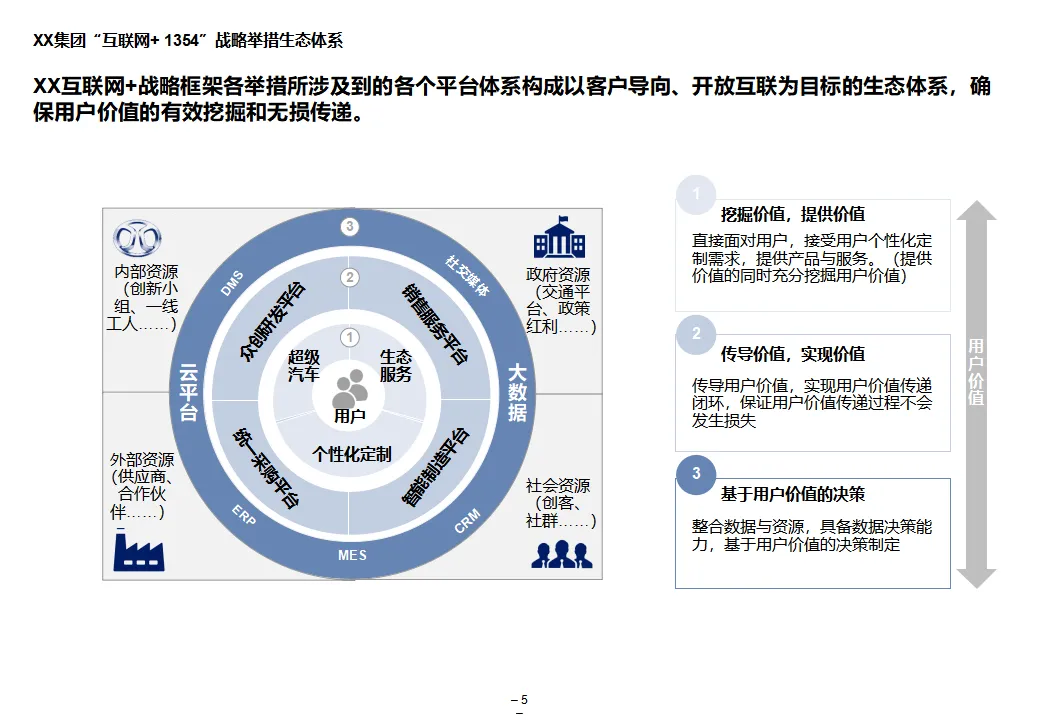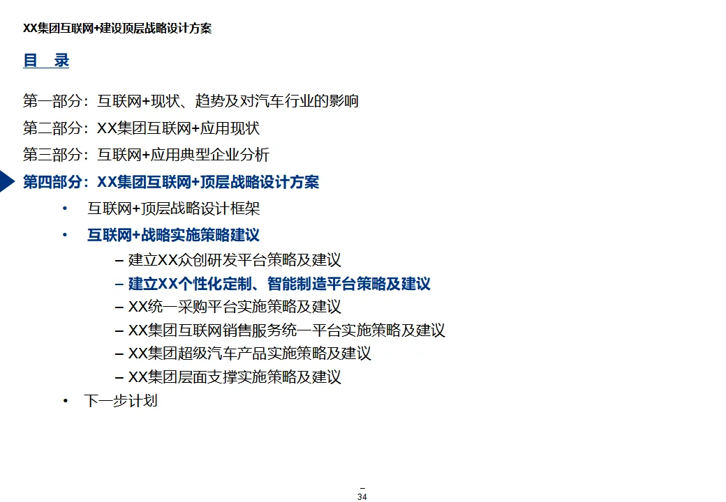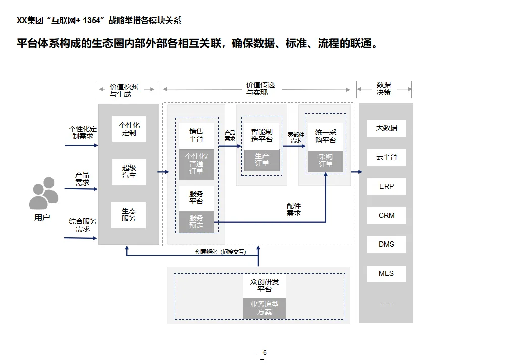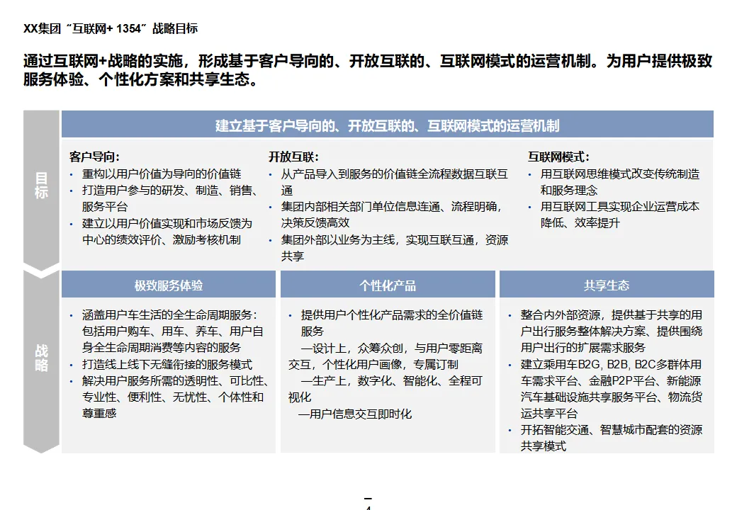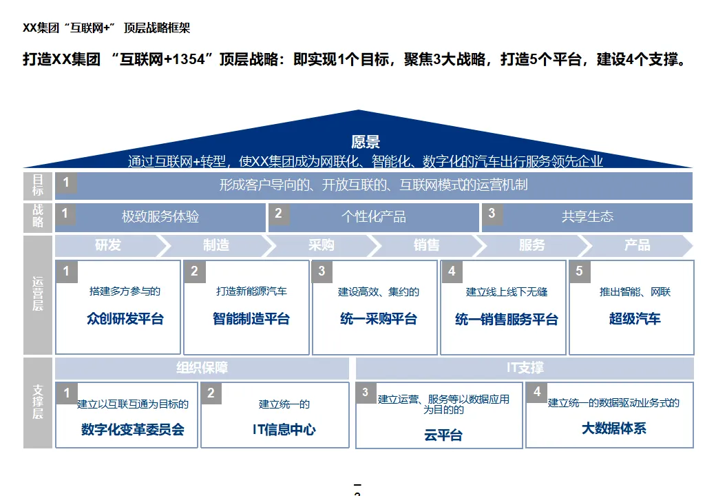 本方案系统阐述了某大型汽车集团“互联网+1354”顶层战略,旨在通过数字化转型打造网联化、智能化、数字化的出行服务领先企业。战略围绕“1个目标、3大战略、5个平台、4个支撑”展开,聚焦极致服务体验、个性化产品与共享生态,构建以客户为导向、开放互联、互联网模式的运营机制。方案核心为五大平台建设:众创研发平台整合内外部资源,实现创意孵化与技术迭代;个性化定制与智能制造平台依托模块化设计与柔性制造,支撑C2B生产与全程可视化;统一采购平台推进集团化采购,提升议价能力与供应链效率;销售服务统一平台覆盖买车、用车、养车、租车、金融全生命周期,打造线上线下融合的服务生态;超级汽车产品以智能驾驶、车联网与生态服务为核心,提升产品力与用户粘性。组织层面,方案提出组建数字化变革委员会、统一信息中心、大数据体系与云平台,推动IT资源集约化与数据驱动决策。实施路径遵循“小步快跑”原则,分阶段推进平台建设与组织调整,确保战略落地。整体方案为大型汽车集团向数字化出行服务商转型提供了系统化、可操作的行动框架。