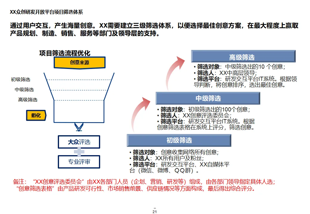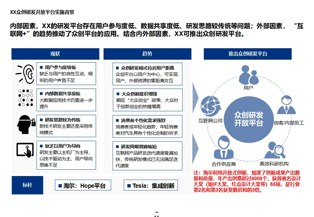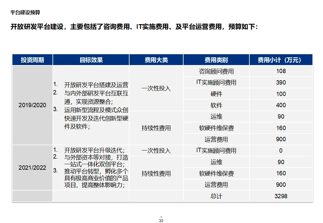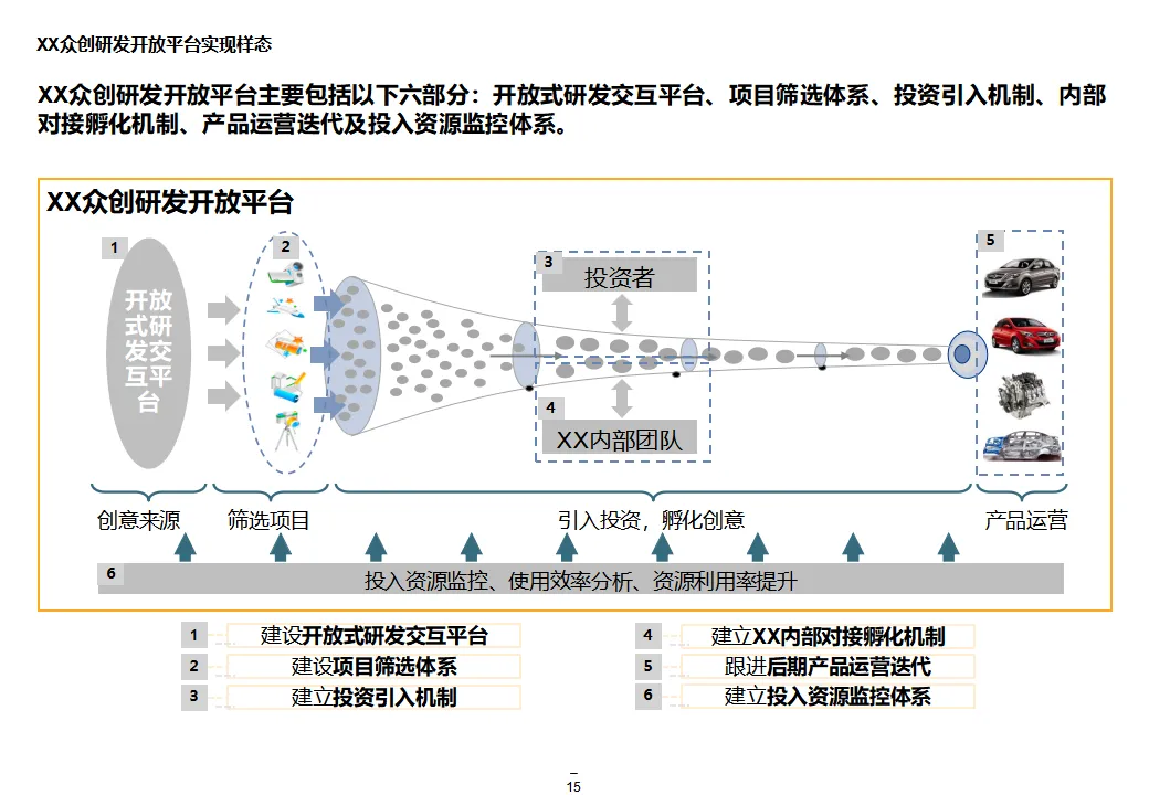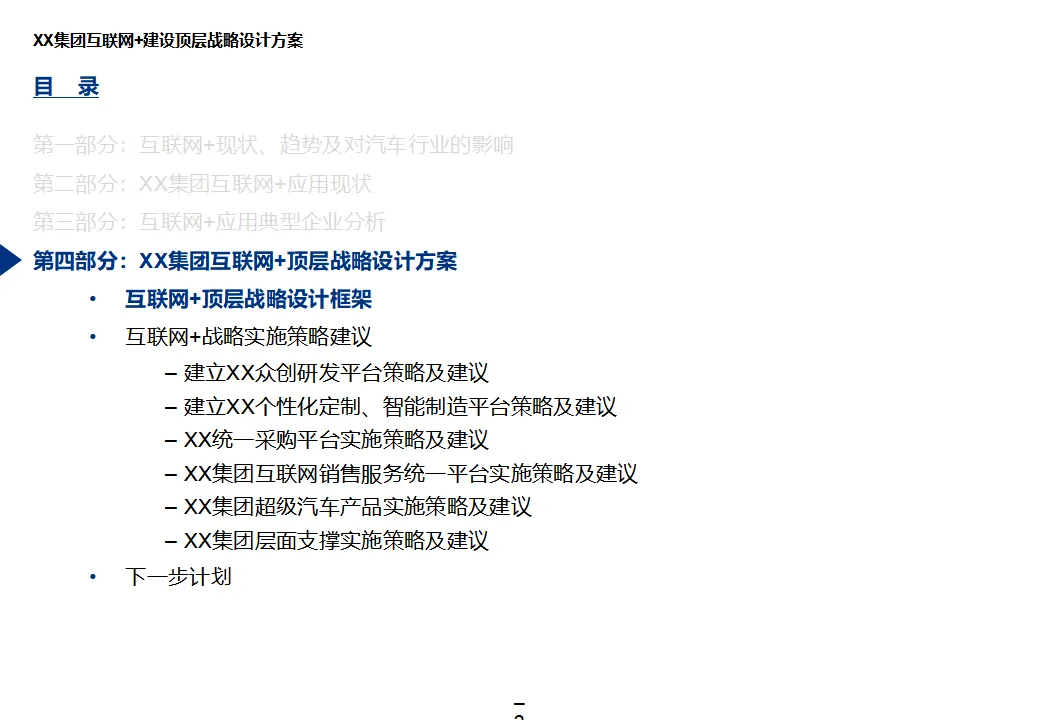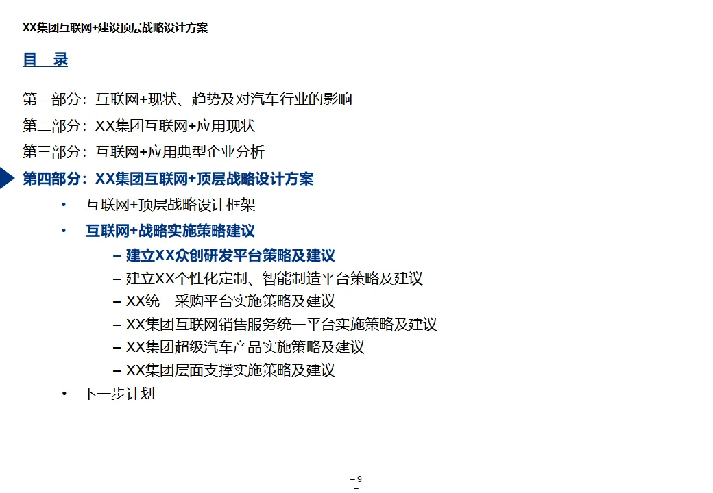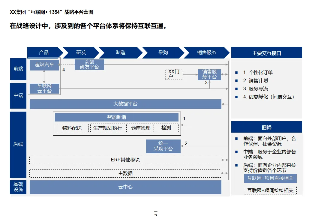 本方案系统阐述了某大型汽车集团“互联网+1354”顶层战略,旨在通过数字化转型打造网联化、智能化、数字化的出行服务领先企业。战略围绕“1个目标、3大战略、5个平台、4个支撑”展开,聚焦极致服务体验、个性化产品与共享生态,构建以客户为导向、开放互联、互联网模式的运营机制。方案核心为五大平台建设:众创研发平台整合内外部资源,实现创意孵化与技术迭代;个性化定制与智能制造平台依托模块化设计与柔性制造,支撑C2B生产与全程可视化;统一采购平台推进集团化采购,提升议价能力与供应链效率;销售服务统一平台覆盖买车、用车、养车、租车、金融全生命周期,打造线上线下融合的服务生态;超级汽车产品以智能驾驶、车联网与生态服务为核心,提升产品力与用户粘性。组织层面,方案提出组建数字化变革委员会、统一信息中心、大数据体系与云平台,推动IT资源集约化与数据驱动决策。实施路径遵循“小步快跑”原则,分阶段推进平台建设与组织调整,确保战略落地。整体方案为大型汽车集团向数字化出行服务商转型提供了系统化、可操作的行动框架。