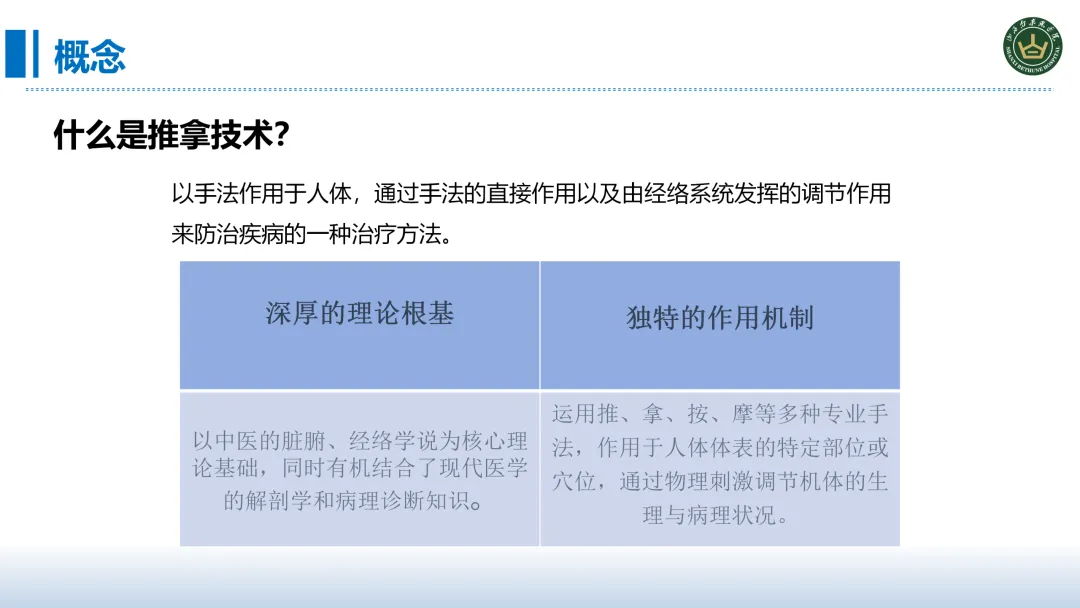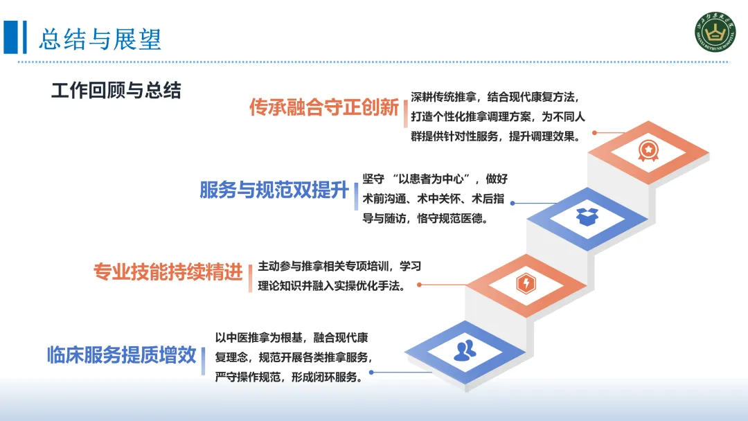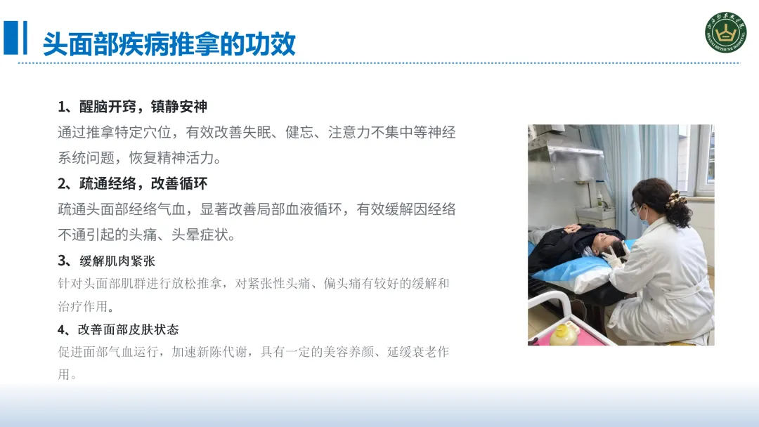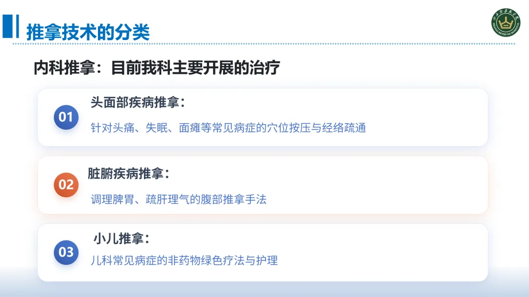 推广推拿技术有两大核心意义:首先它弥补了西医无创伤调理的一个短板,西医在药物、手术方面有显著的优势,但在术后康复、慢病管理、疼痛缓解等场景中,缺乏安全、无创的调理手段,而推拿技术正好满足这一需求,为患者提供更温和的康复方式。再者完善我院医疗护理体系的一个形成,形成西医诊疗+中医推拿+护理干预一体化模式,丰富了我们诊疗护理服务手段让我们更好的应用复杂多样的患者病情,契合患者多元化康复的需求,同时提高了我院护理服务的竞争力。