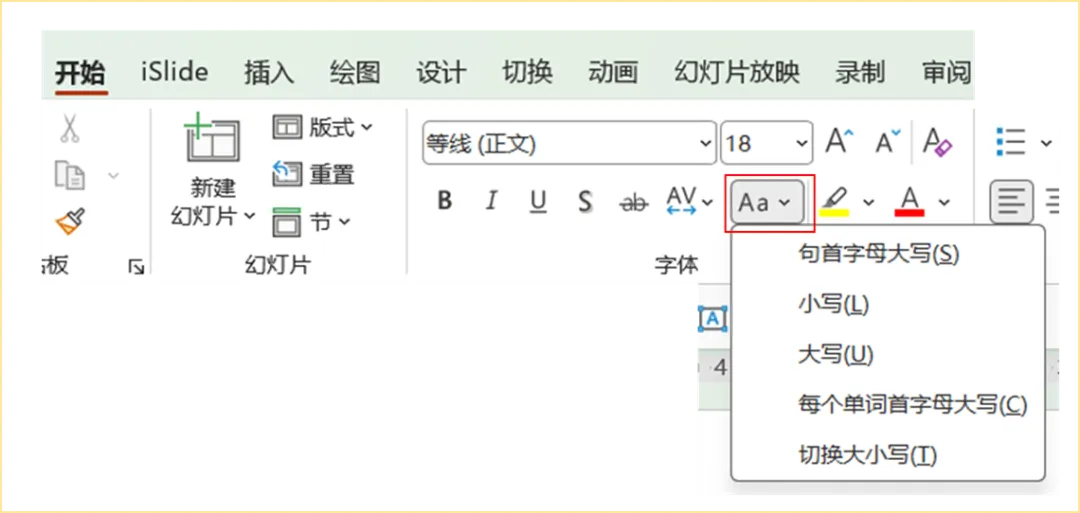 选中需要修改的英文文本框,点击开始选项卡,找到更改大小写按钮图标【Aa】点击下拉菜单就可以看到 “句首字母大写”,“全部小写”,“全部大写“”,“每个单词首字母大写“”,“切换大小写” 5种模式,按需选择即可!
