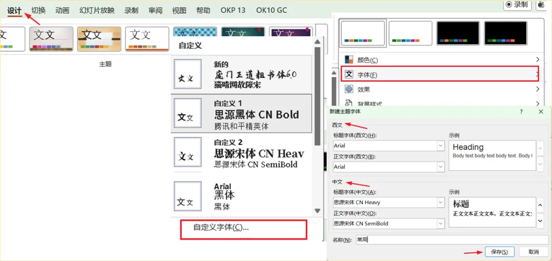 打开PPT 新建空白页,点击顶部设计选项卡,找到变体下拉找到字体,选择自定义字体,分别设置西文字体和中文标题字体正文字体,输入名称保存即可。